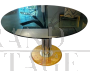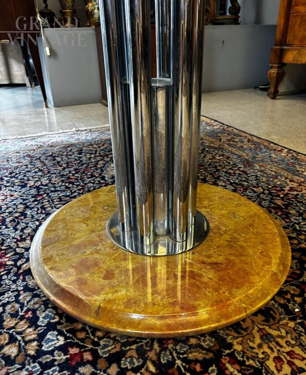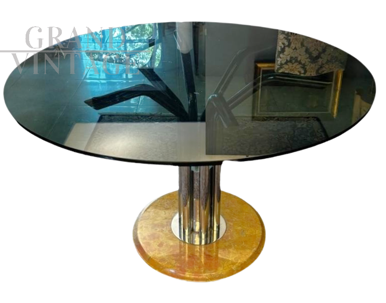 Tavolo rotondo vintage in acciaio, vetro fumé e marmo giallo, anni ‘70