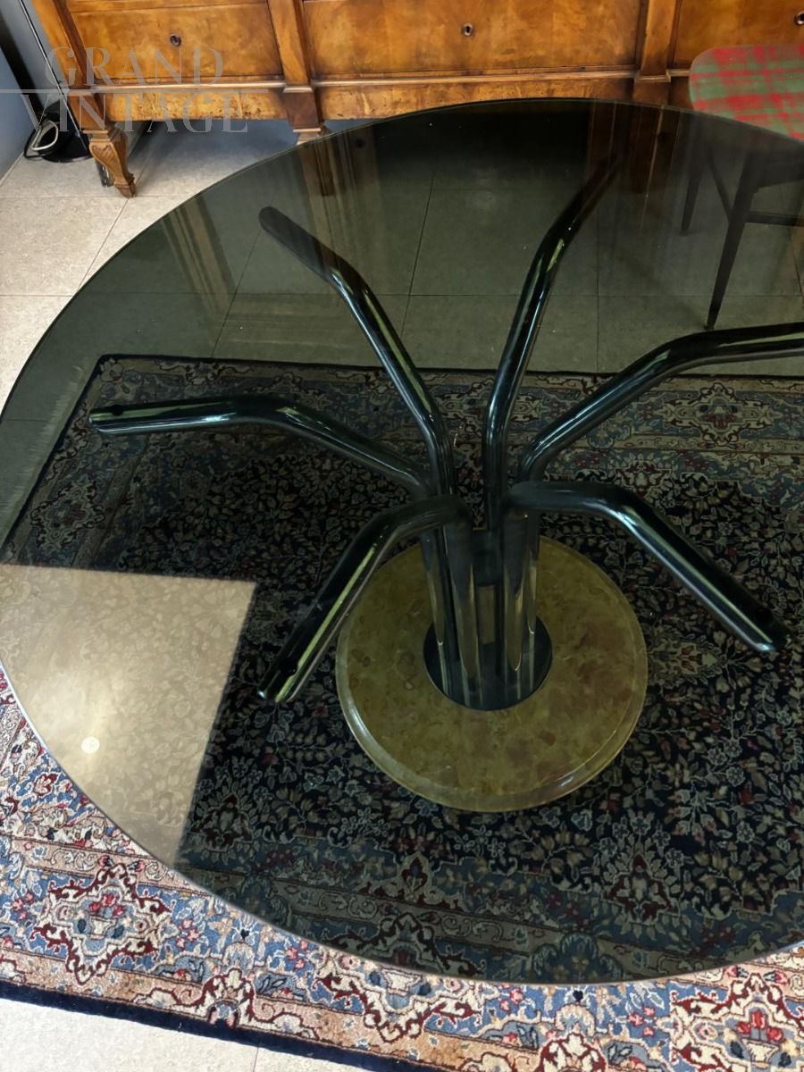 Elegante tavolo da pranzo vintage rotondo con piano in vetro fumé con diametro 110 cm, base in bellissimo marmo giallo e struttura centrale a sei steli curvati in metallo cromato, Italia anni '70.