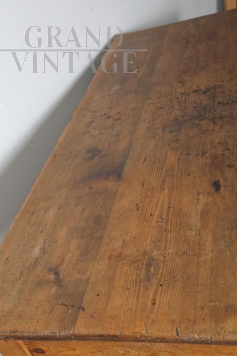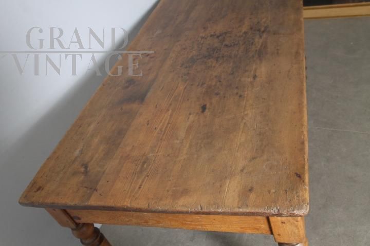 Antico tavolo rustico provenzale da osteria in legno massello di pino, di fine '800, con gambe tornite e cassetto centrale. Molto bello, restaurato al naturale con finitura di sola cera d'api.