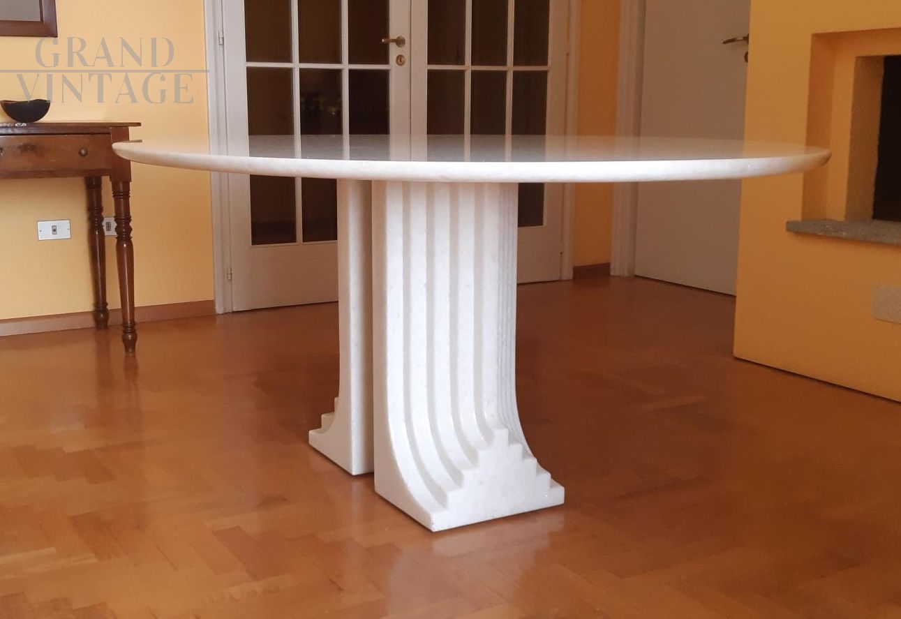 Poggia su due pilastri a strati, in un unico blocco. Raro esemplare ormai fuori produzione, il piano ovale dI grande spessore non presenta venature nere in quanto è stato uno degli ultimi esemplari realizzati con marmo di NAXOS poi andato esaurito per sempre.