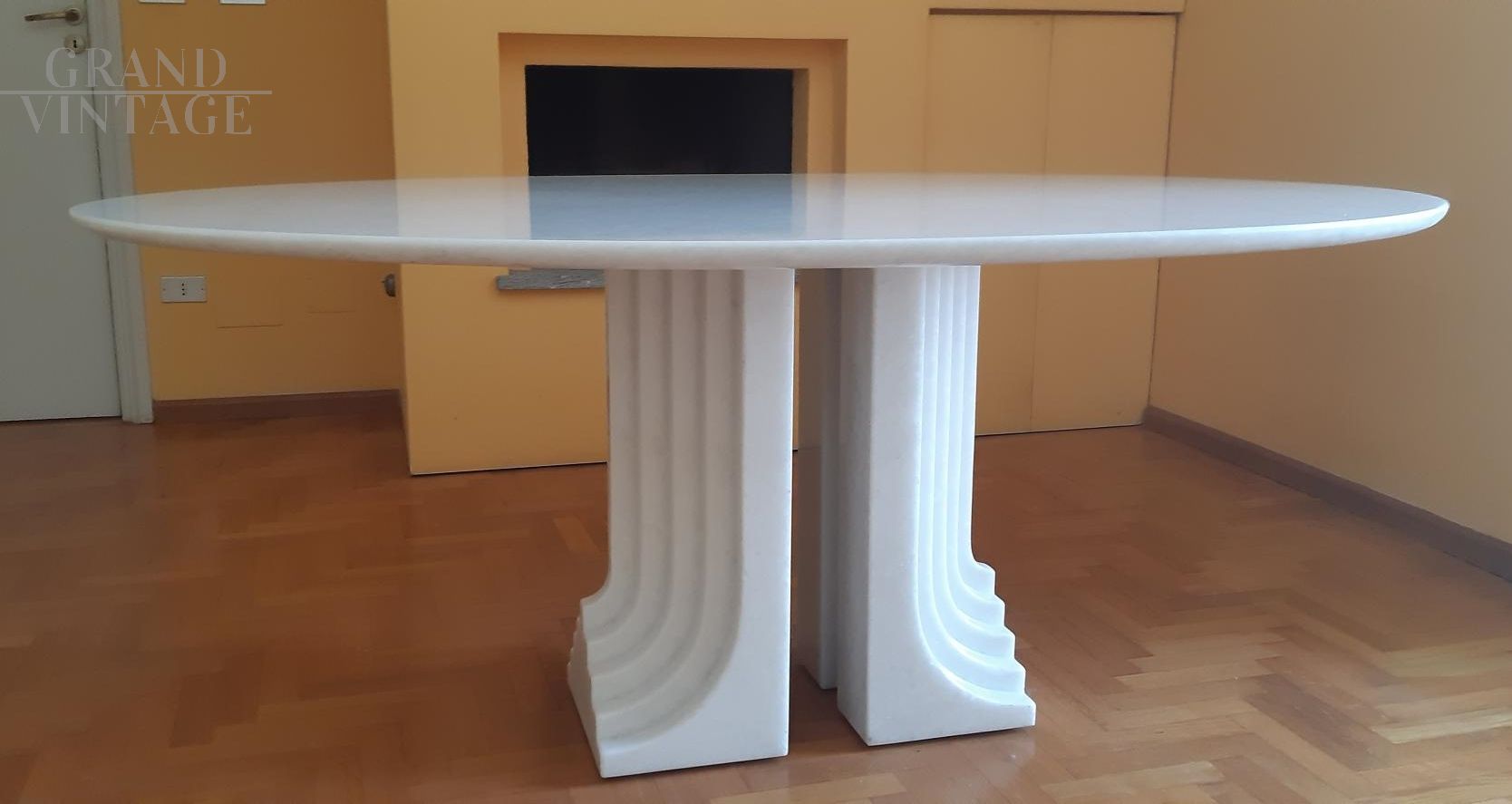 Tavolo da pranzo ovale modello SAMO disegnato da Carlo Scarpa nel 1970 e prodotto da Simon-Gavina in marmo di NAXOS bianco cristallino.