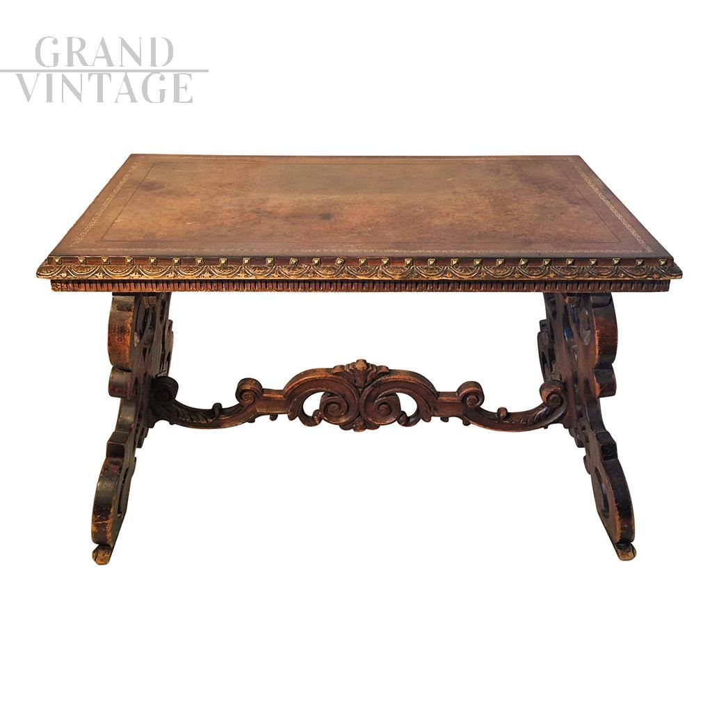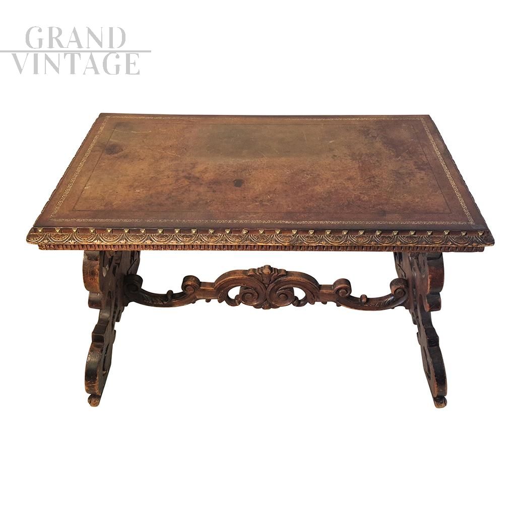 Tavolo scrittoio antico di epoca XIX secolo con struttura in legno di noce massello con lavorazioni ad intaglio e piano in cuoio con borchie a perimetro.