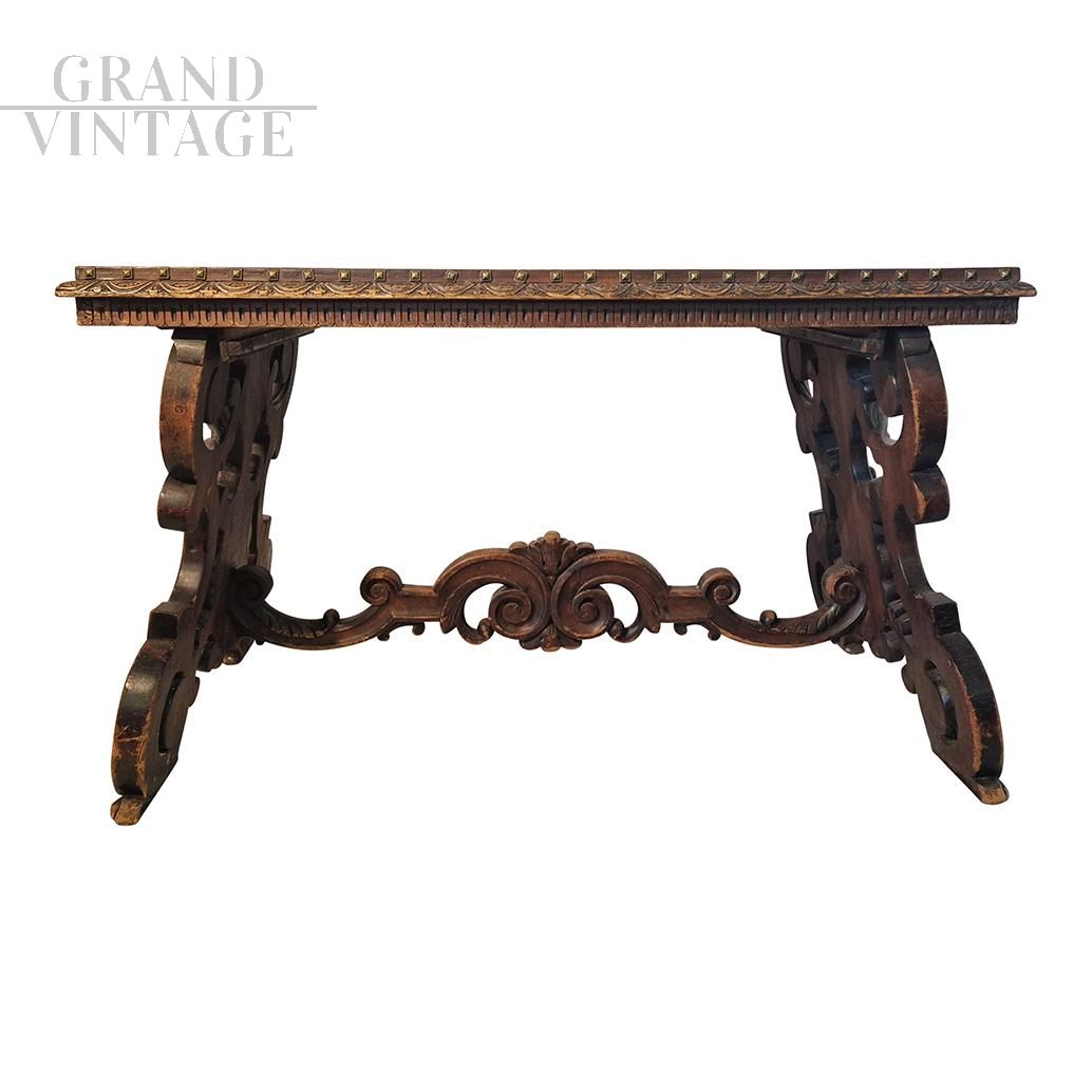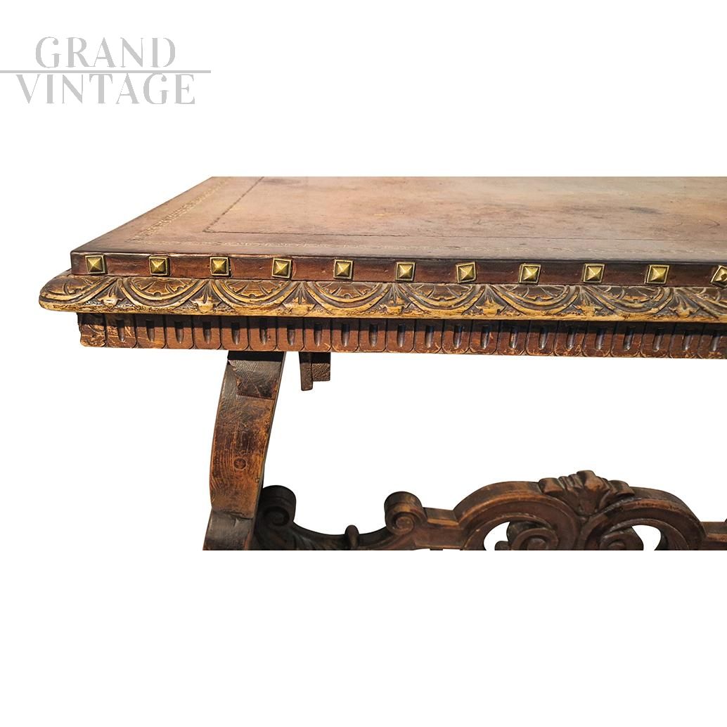 Tavolo scrittoio antico intagliato con piano in cuoio borchiato