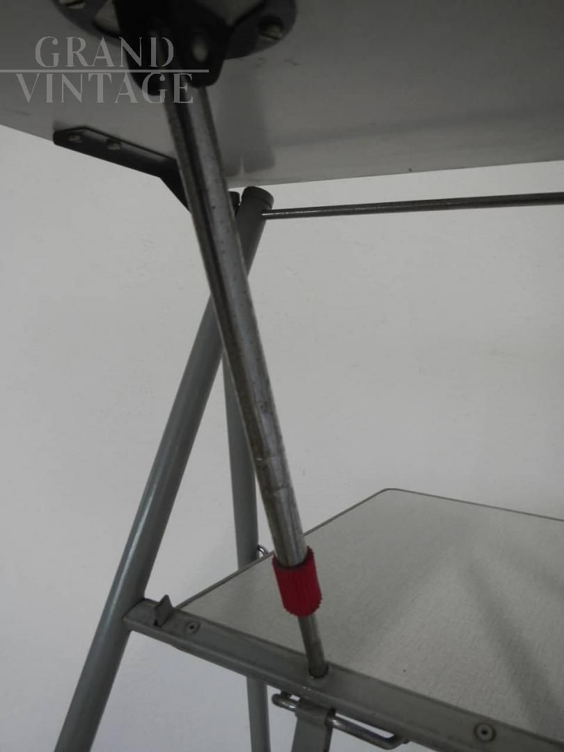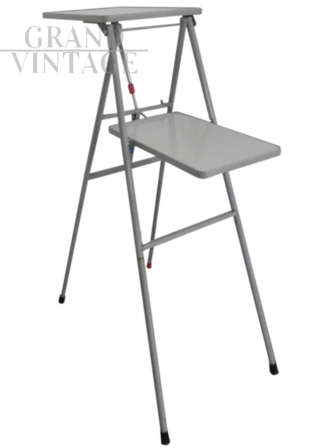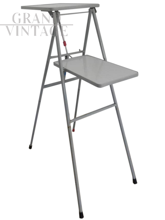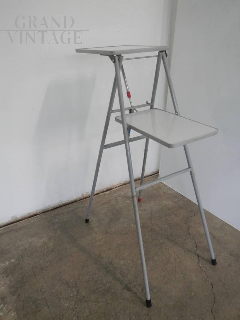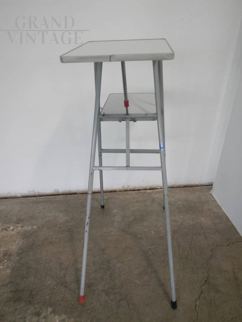 Trespolo per proiettore anni '70 della ditta olandese Negema Bussum Holland, ripieghevole con piani in formica e struttura in metallo.
