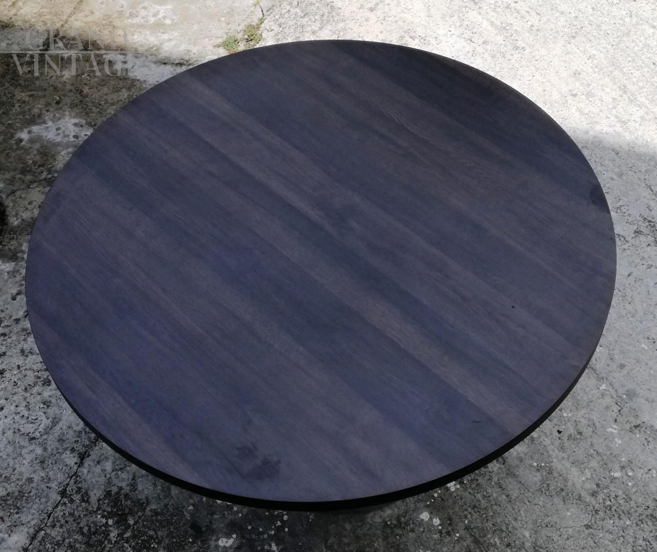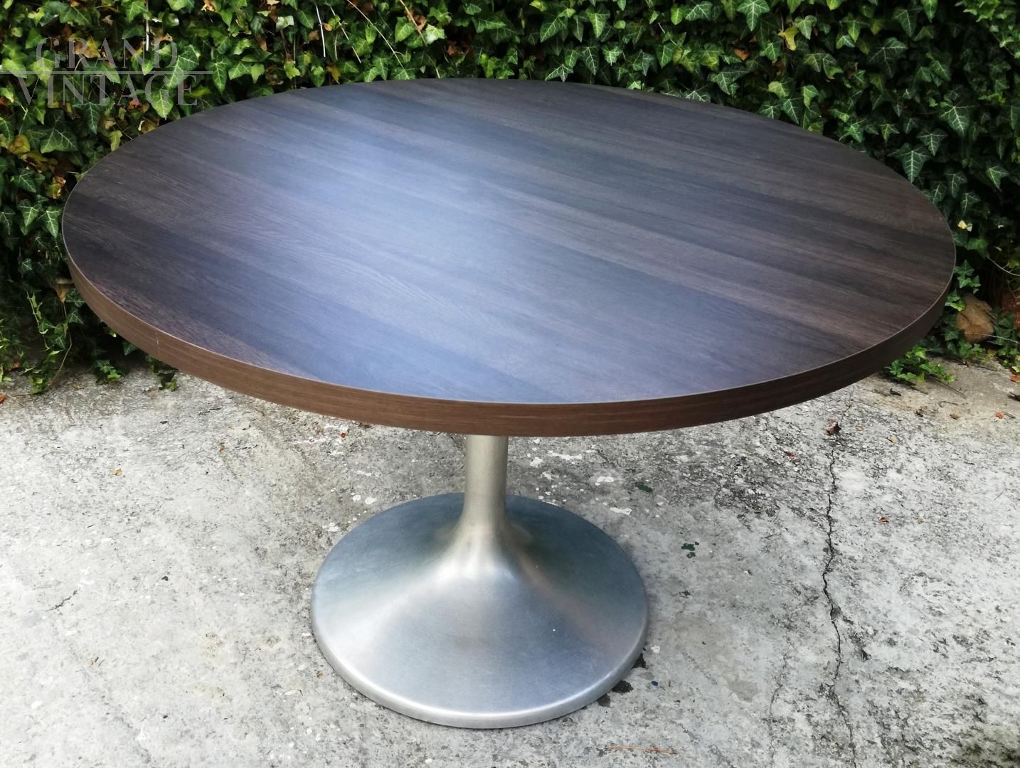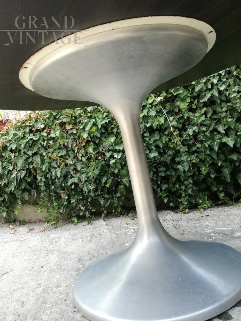 Tavolo da pranzo vintage stile Tulip con base in acciaio satinato e piano in legno wengé con diametro 120 cm e spessore di 4 cm. La base è usata e presenta normali segni d'uso, il top è usato ma di produzione più recente. Il tavolo è stabile e robusto.