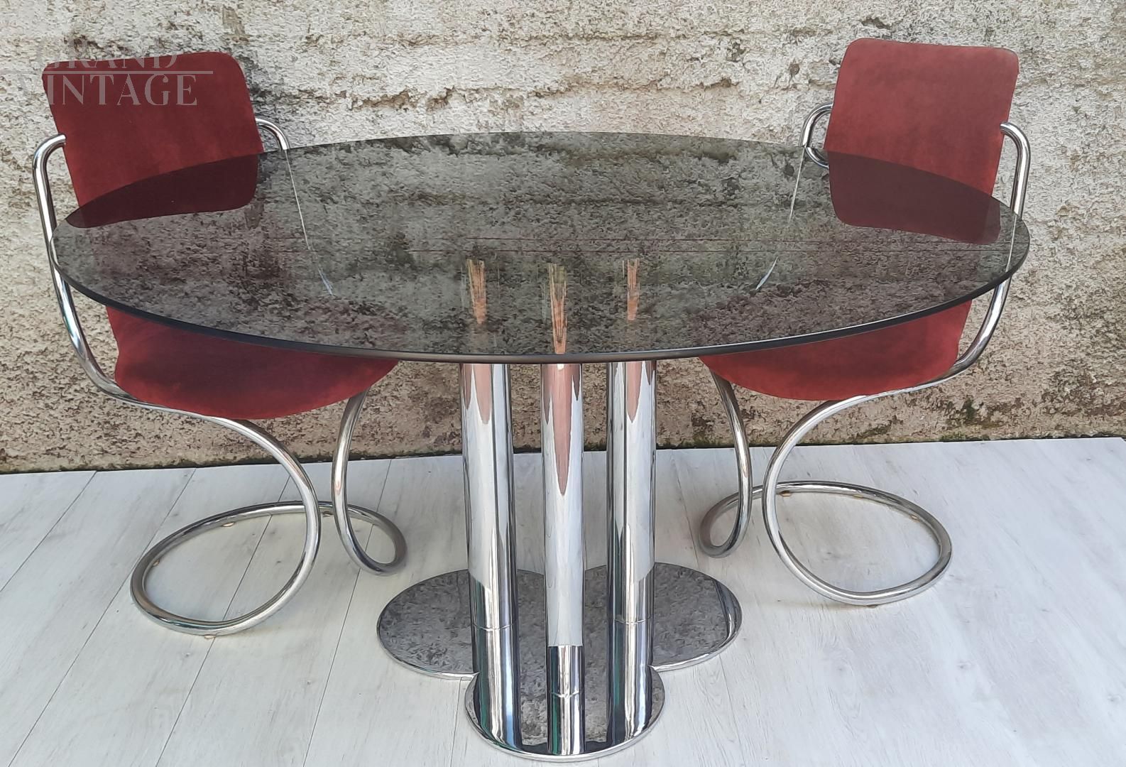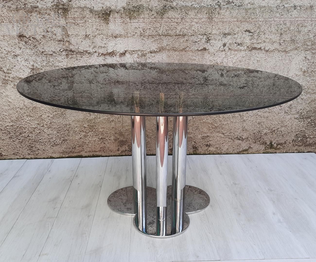 Tavolo modello Trifoglio di Sergio Asti per Poltronova, con piano tondo in vetro fumé e gamba centrale a trifoglio cromata. Il vetro presenta qualche normale graffio, per il resto in ottime condizioni. Il vetro temperato si fissa alla gamba centrale con dei dadi.