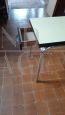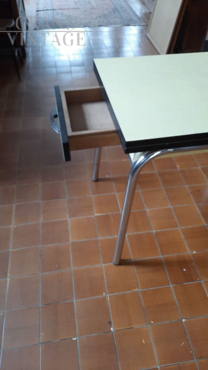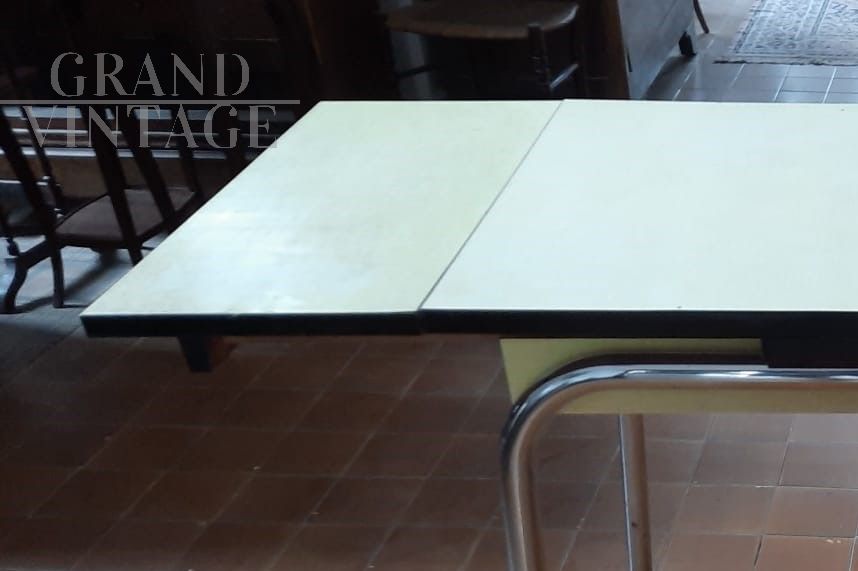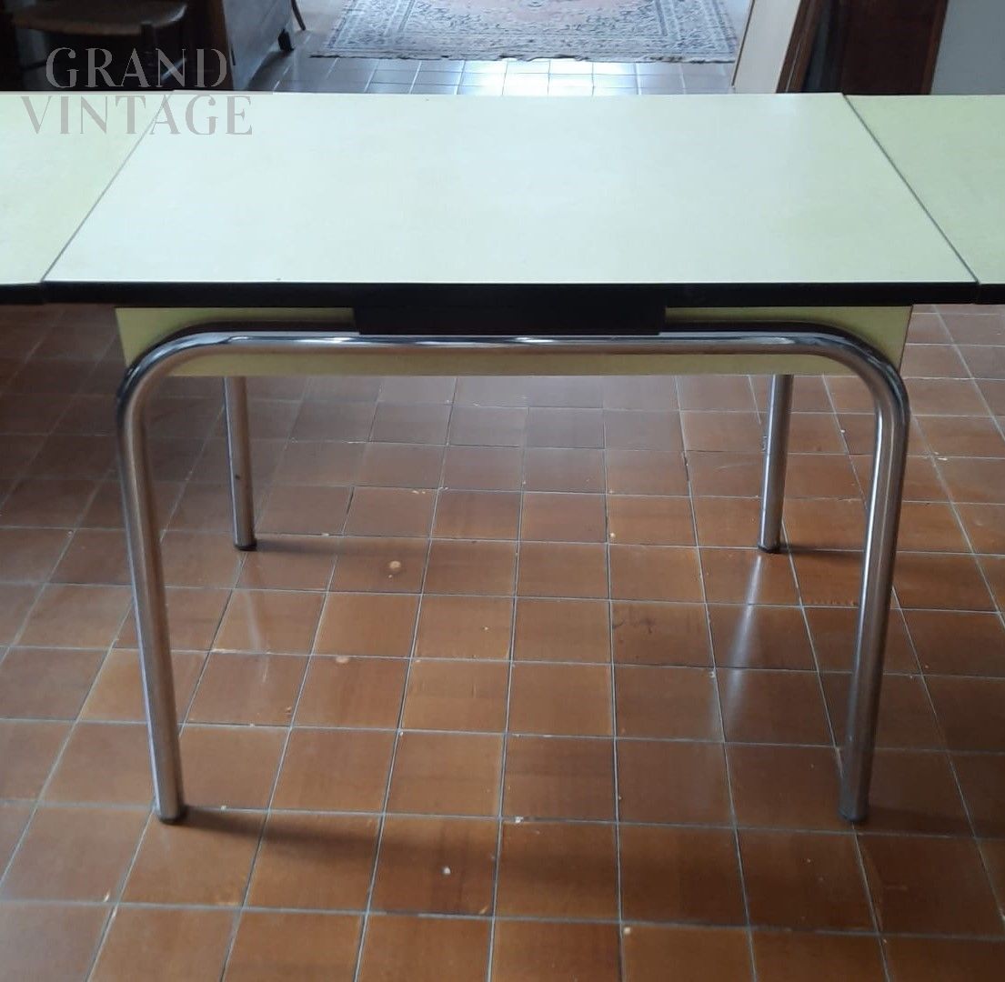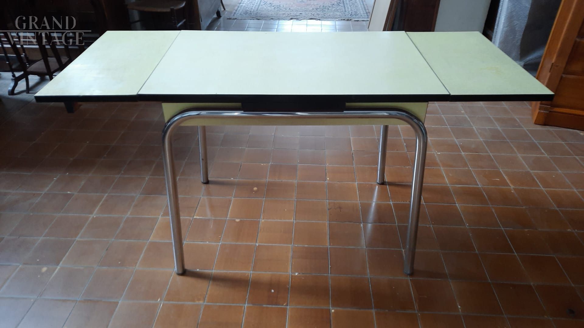 Tavolo vintage in formica verde allungabile con gambe in metallo cromato, in ottime condizioni, presenta i naturali segni del tempo.