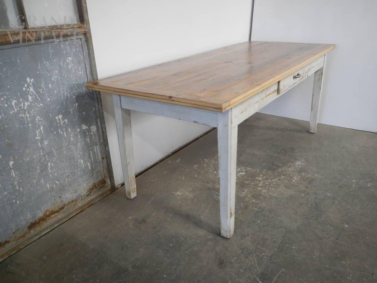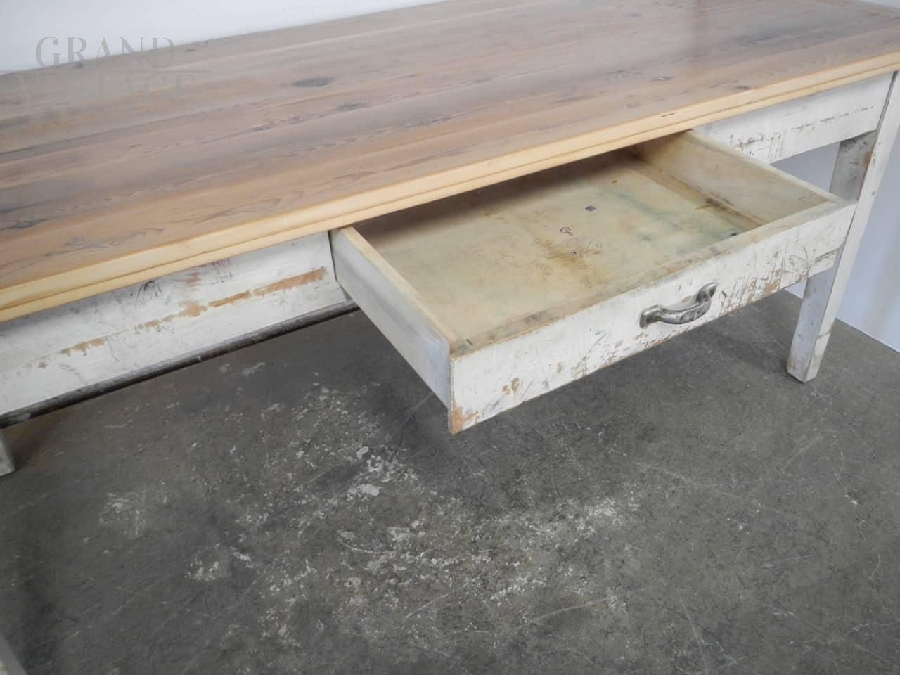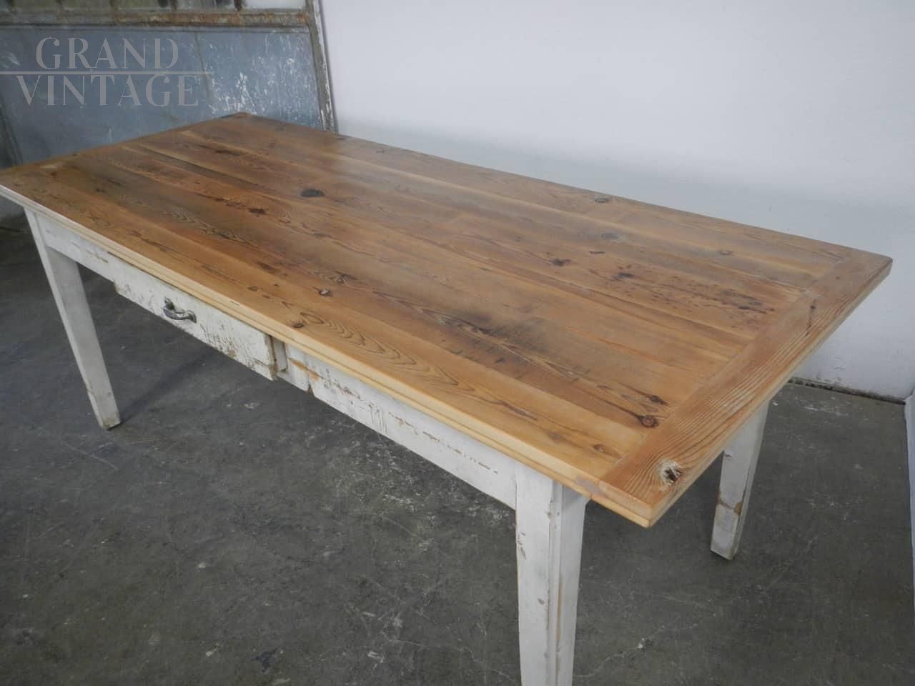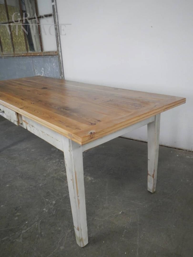 Tavolo da cucina vintage in abete verniciato bianco con piano in larice naturale, completo di cassetto. Restaurato e in buone condizioni. Altezza per la seduta: 65 cm.