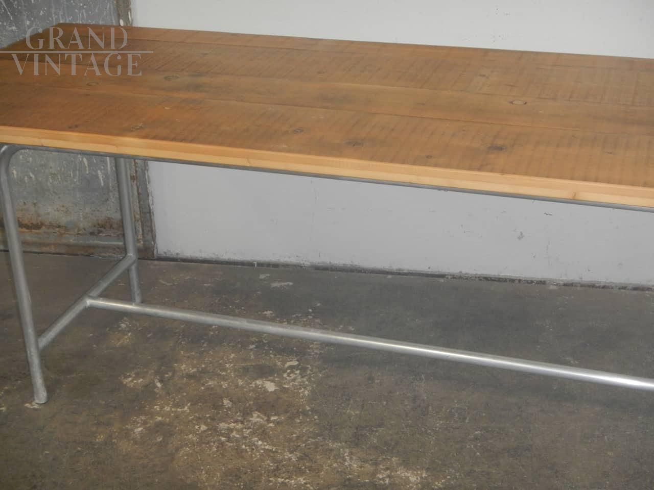 Tavolo vintage in stile industriale con base in tubolare di alluminio e piano in abete, completamente restaurato.