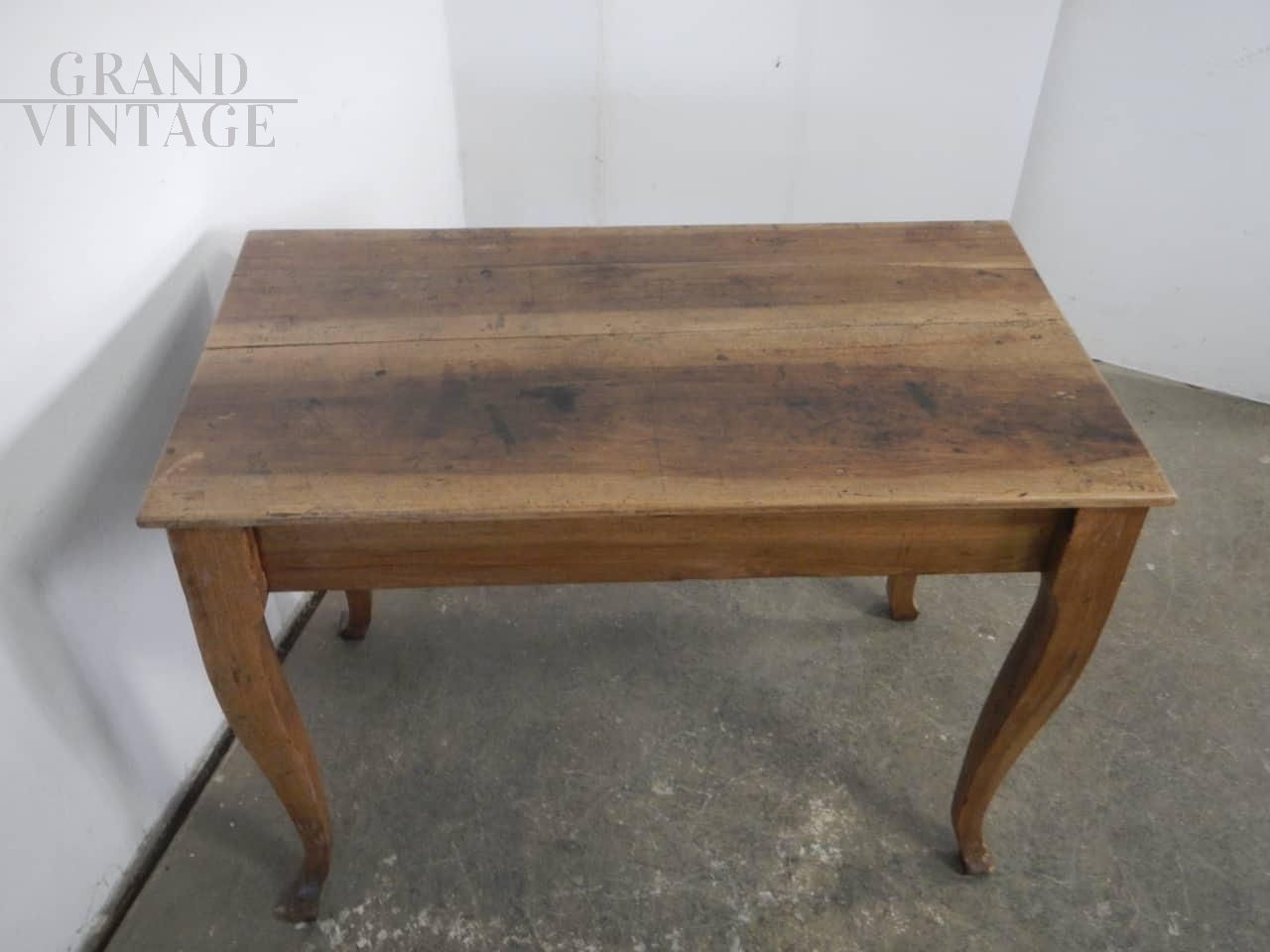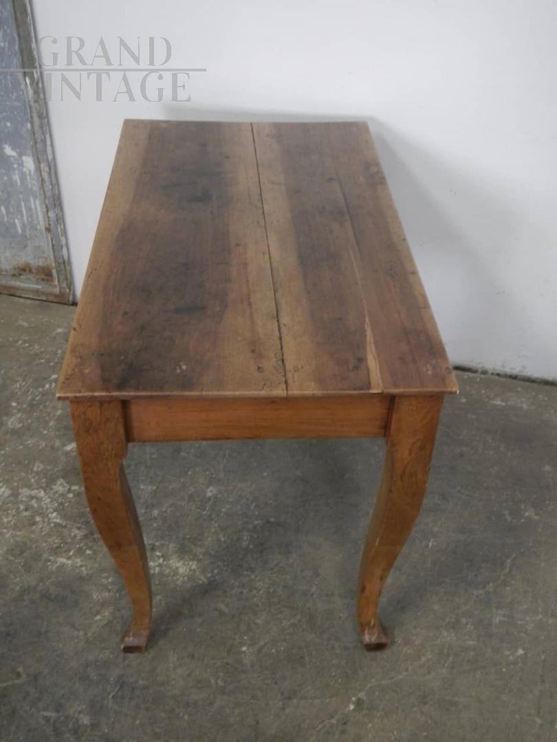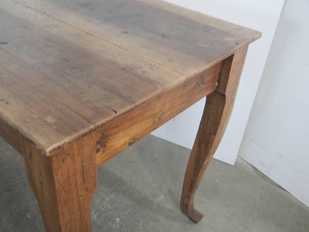 Tavolo da pranzo classico in legno di noce dall'aspetto rustico country, con belle gambe curvate, restaurato mantenendone i bei segni dell'uso.