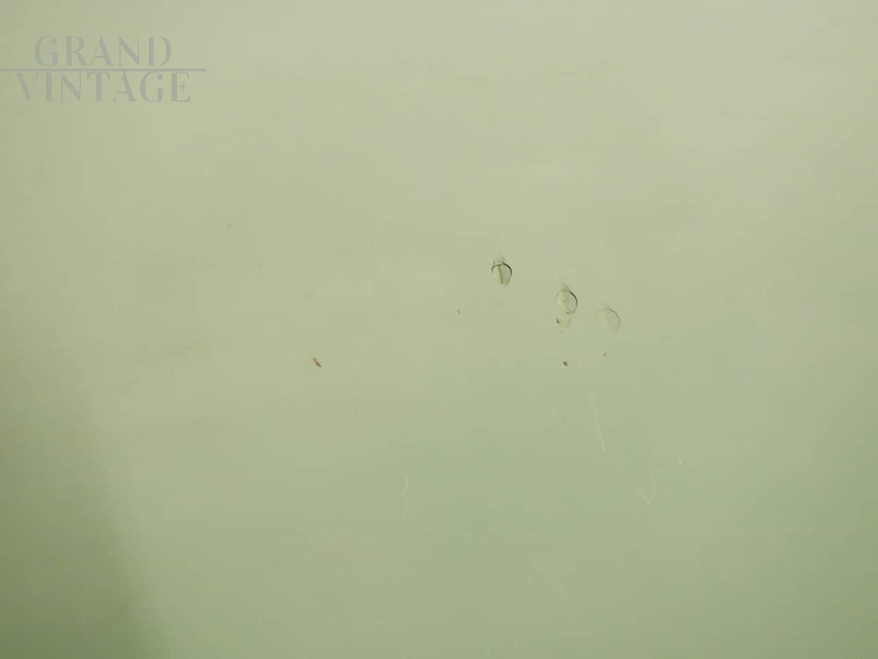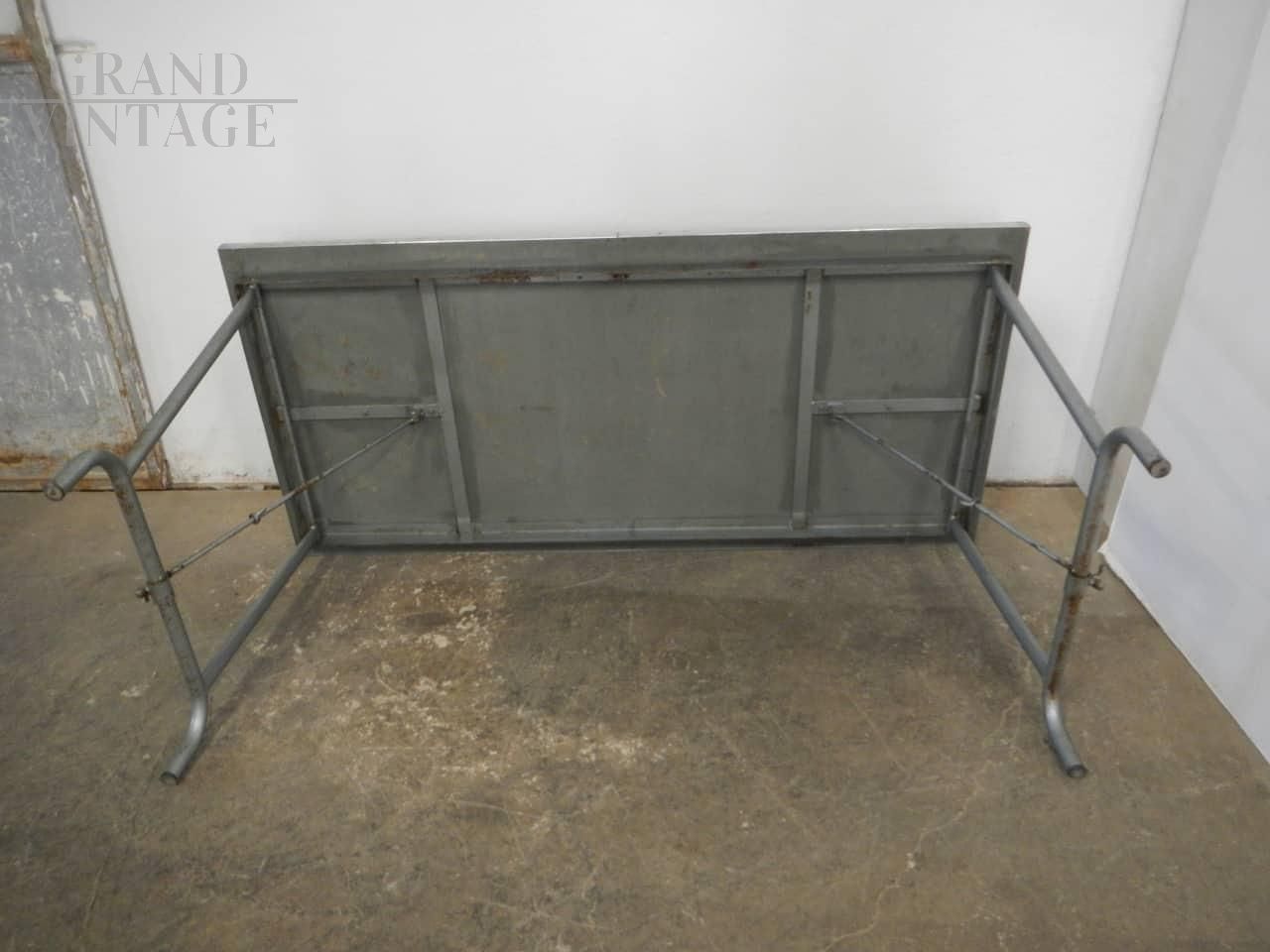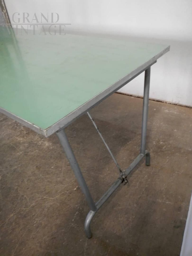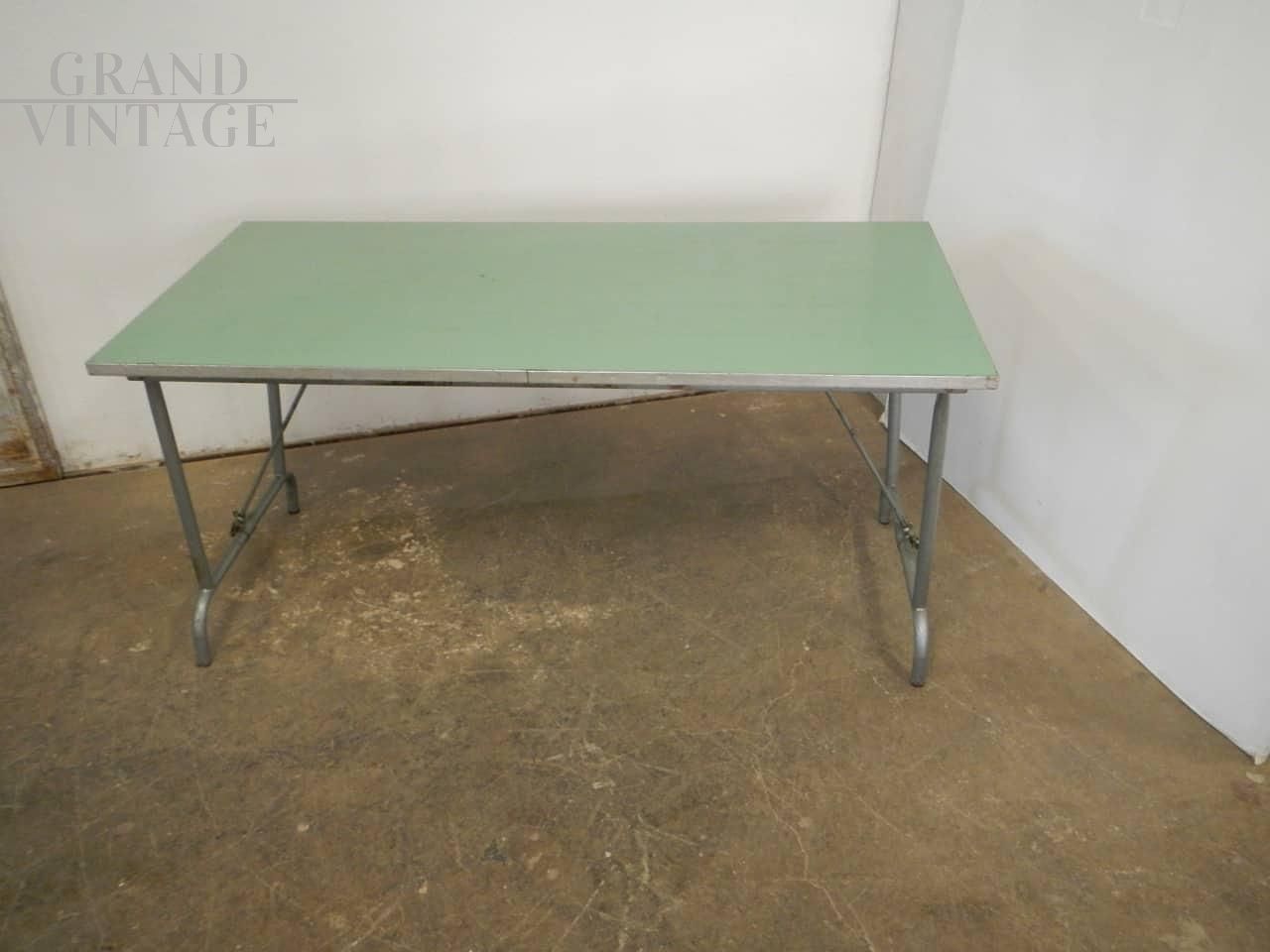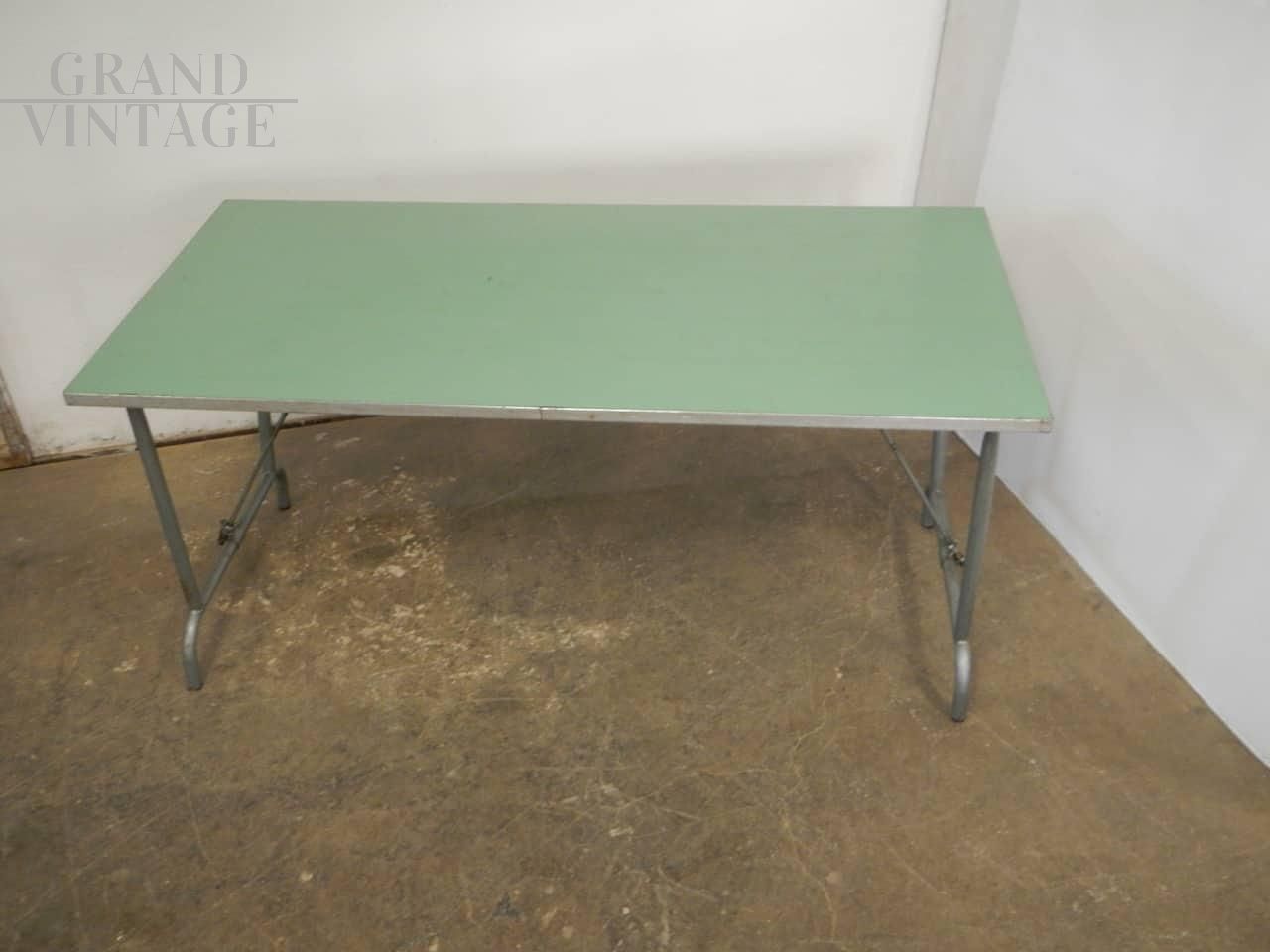 Tavolo pieghevole vintage in ferro zincato con piano in legno compresso e formica verde. Il tavolo presenta segni d’uso nel piano e in alcune parti della struttura. Trattato con vernice da ferro che lo rende liscio al tatto.