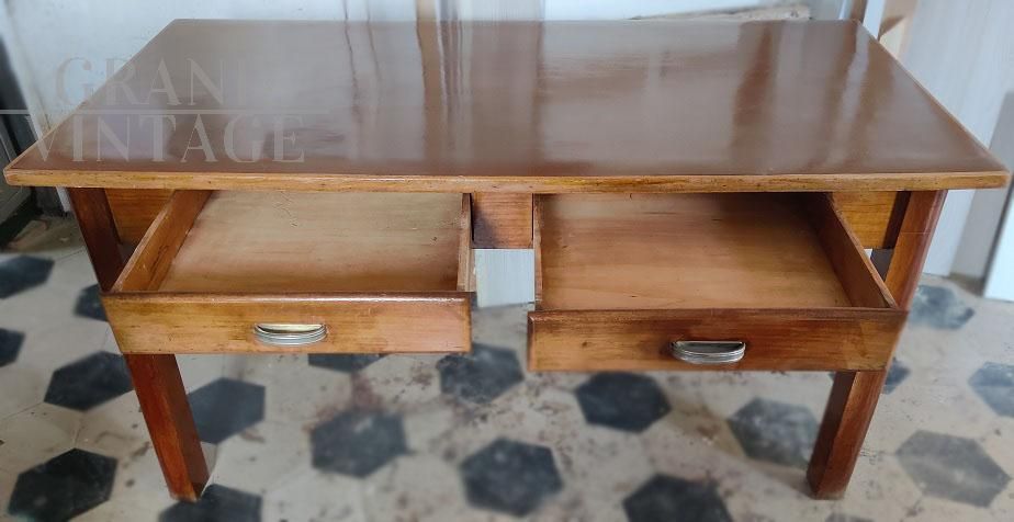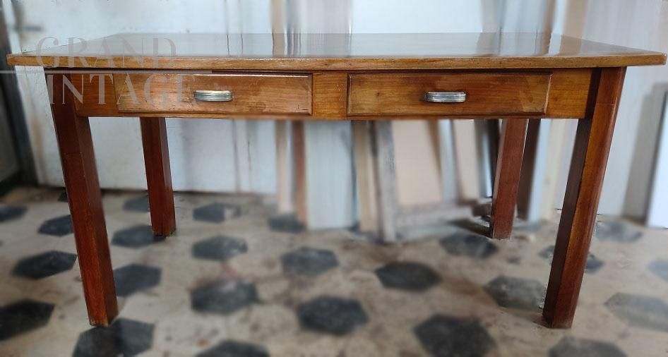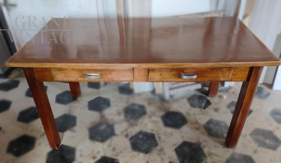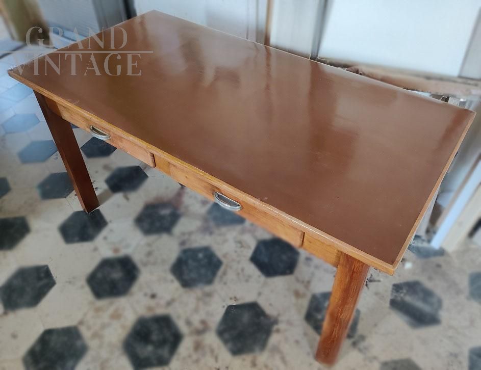Tavolo vintage stile rustico di forma rettangolare con due cassetti, modernariato italiano della prima metà del '900, originale. Il tavolo è costruito in legno di ciliegio, con 2 cassetti in battuta con maniglie originali. Pianale in legno profilato in legno di faggio con rivestimento in linoleum originale color marrone. Gambe a parallelepipedo stondato sui frontali. Tavolo restaurato in perfette condizioni, con finitura in patina originale a gommalacca e cere.