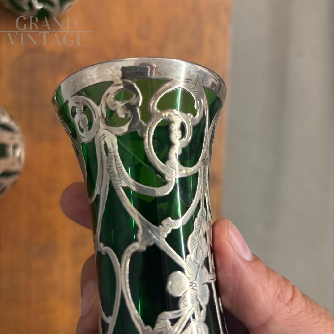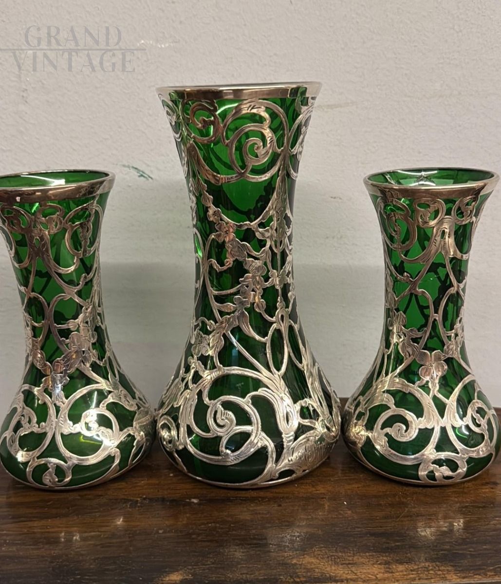 Trittico di vasi liberty in vetro soffiato verde con decoro in argento, epoca art nouveau anni '30, in buone condizioni, le parti in vetro presentano lievi difetti visibili all'interno, come da foto.