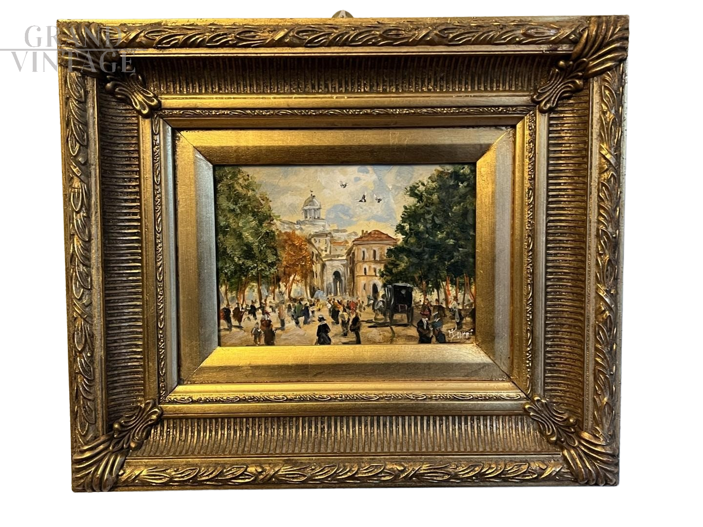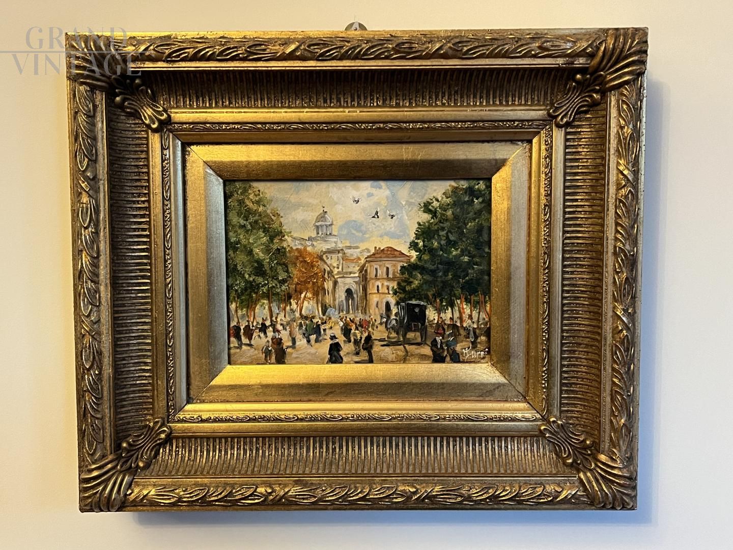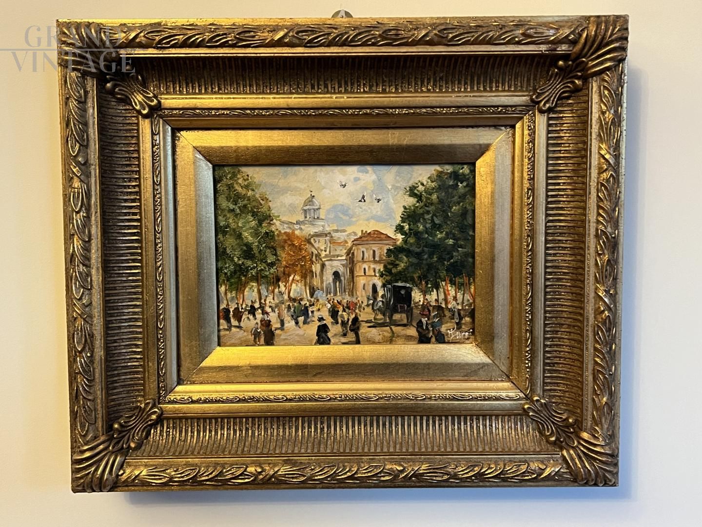 Pregevole dipinto dell'artista italiano Turri raffigurante la veduta di una piazza italiana. Un'opera dai colori luminosi realizzata ad olio su tavola e firmata a mano dell'artista in basso a destra. La tavola è racchiusa entro una pregevole cornice dorata che esalta ulteriormente il dipinto. Opera munita di certificato d'Autenticità.
