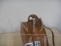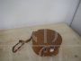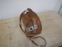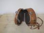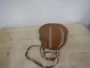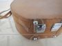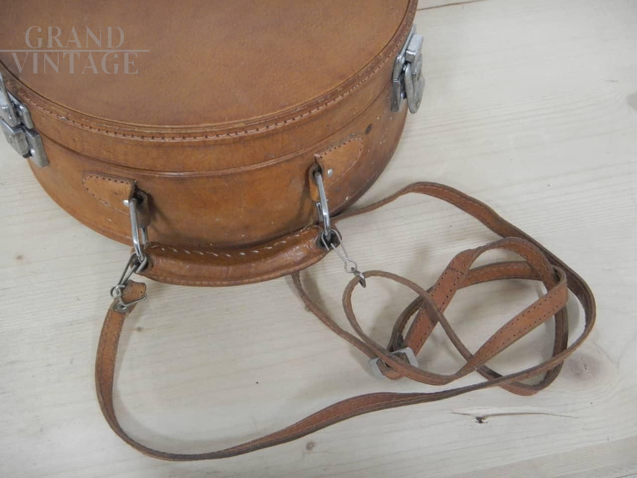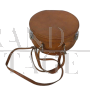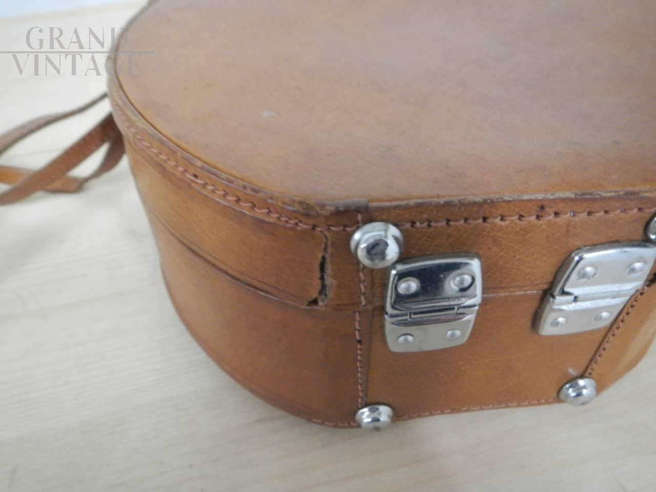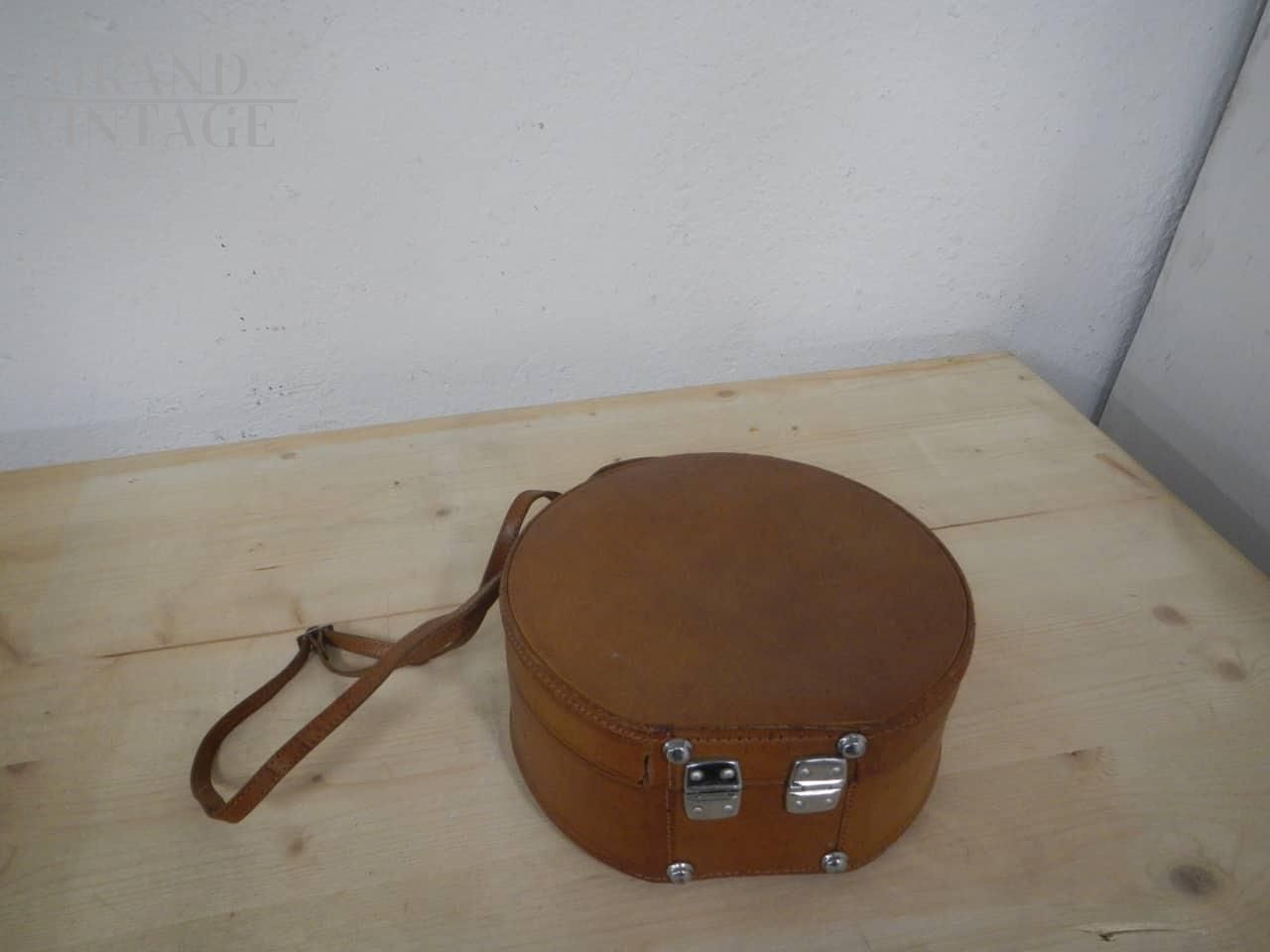 Piccola valigetta borsetta rotonda vintage in cartone e pelle marrone, con manico e tracolla. In buone condizioni, con un piccolo strappo come da foto. Rifiniture in metallo.