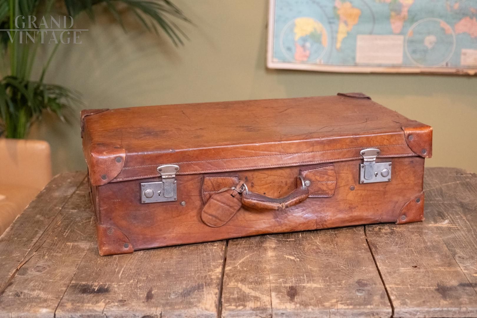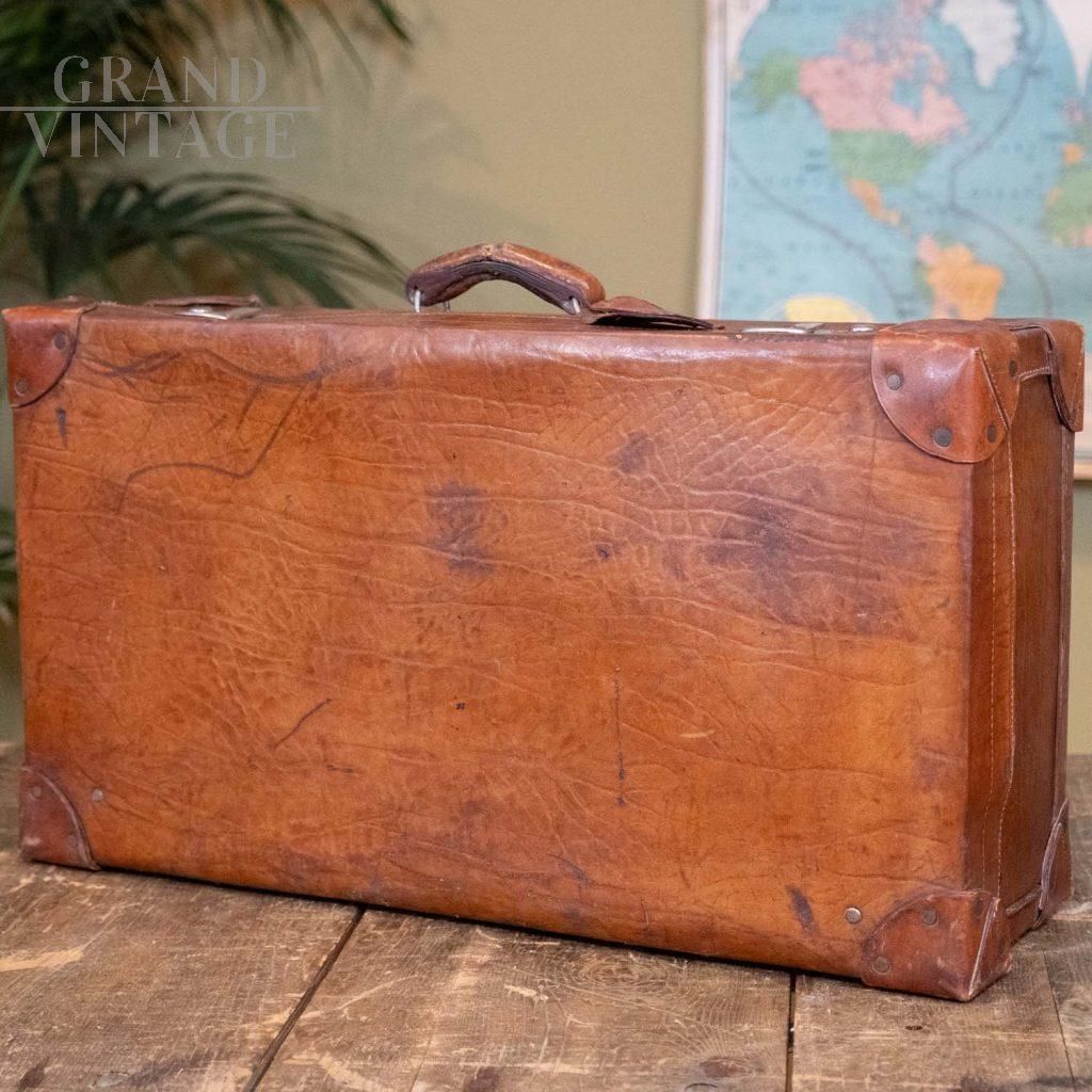 Elegante valigia vintage in cuoio naturale, con scompartimenti interni e completa di chiave, perfetta per chi cerca un accessorio sofisticato e resistente. Un must per gli amanti del vintage.