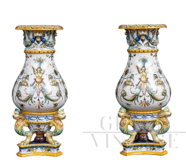 Dimensioni: altezza 20 cm, diametro 10.50 cm. Molto bello il classico decoro dipinto a mano con paesaggio e case. Presenta piccole naturali imperfezioni e filature antiche, come da foto.
