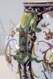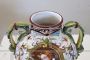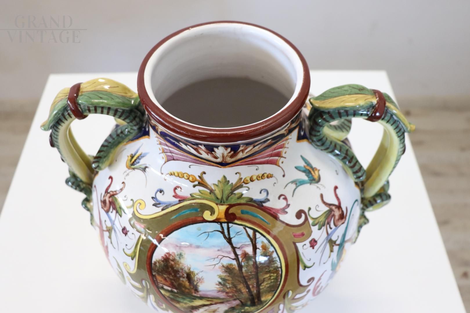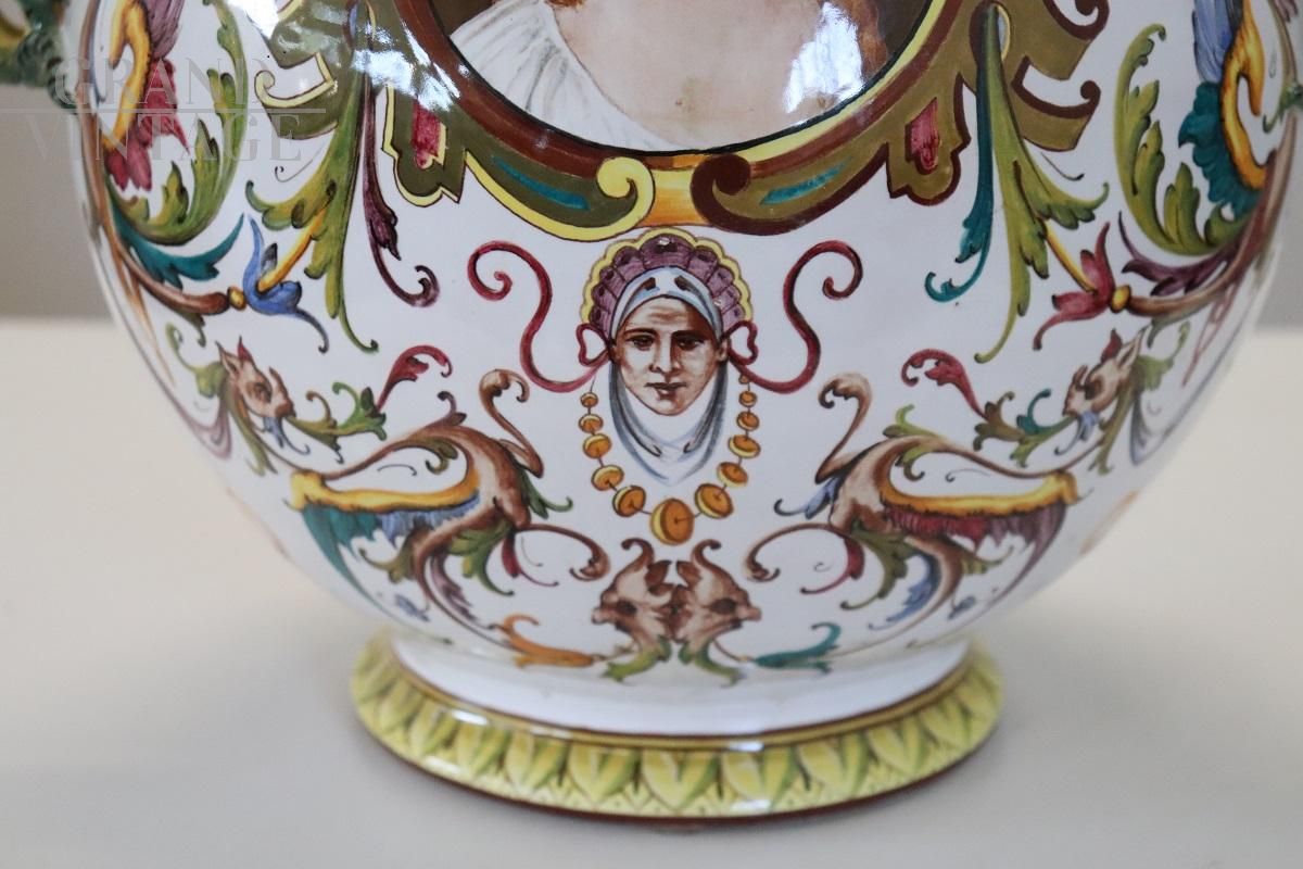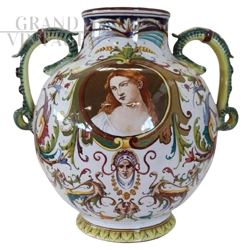 Splendido vaso realizzato a Faenza, in Italia, e risalente agli anni Cinquanta. Il vaso è realizzato in ceramica smaltata policroma. L'accattivante decorazione dipinta in stile classico che adorna ogni lato di questo vaso cattura sicuramente l'attenzione. Un lato presenta il ritratto di una giovane donna al centro, mentre l'altro presenta un bellissimo paesaggio. Il vaso reca sul fondo i marchi Cacf Faenza e I Fabbri; questo marchio identifica il lavoro del ceramista Ilario Fabbri come "Cooperativa Artigiana Ceramisti Faentini", una cooperativa di artisti della ceramica fondata nel 1945. Questo grande ed elegante vaso sarebbe un'aggiunta ideale al tavolo d'ingresso, al soggiorno o alla sala da pranzo. Prezzo trattabile.