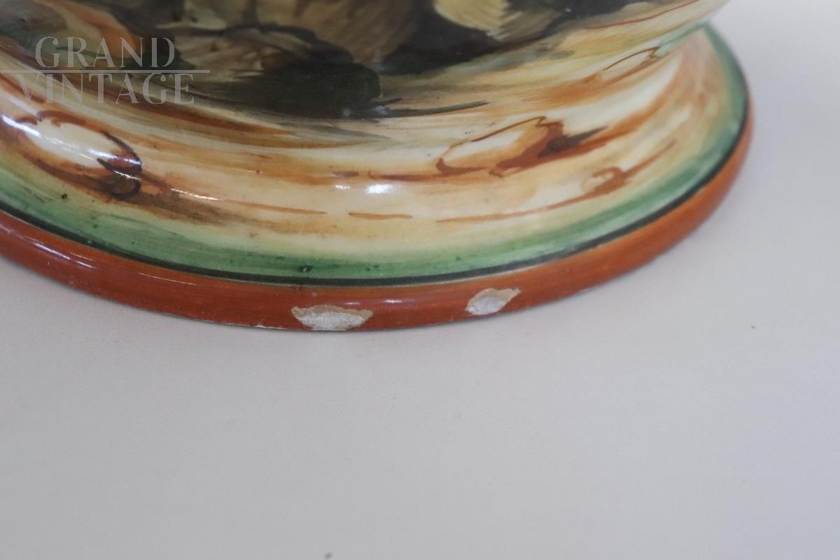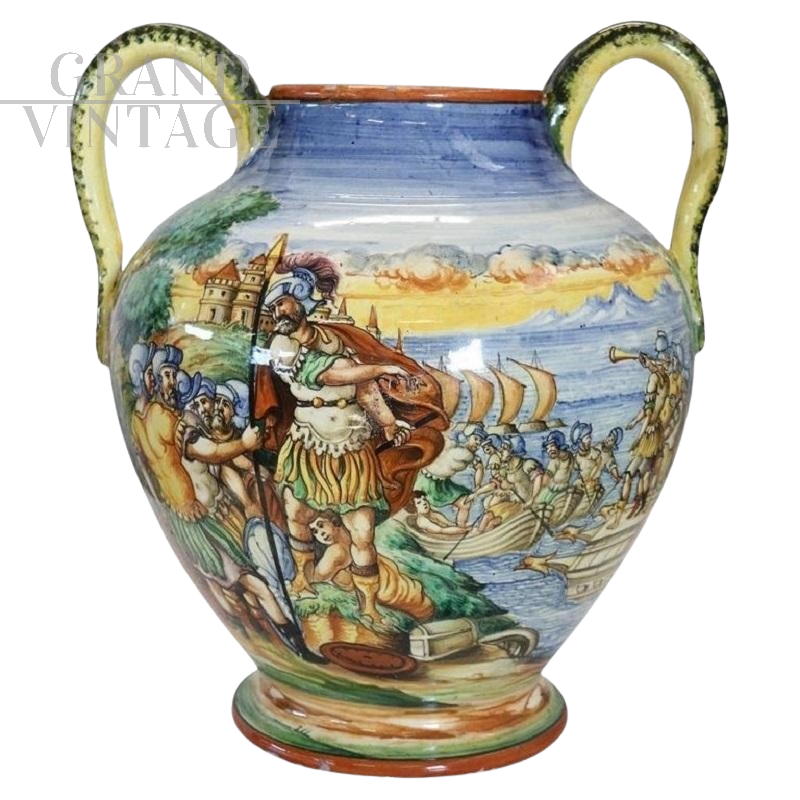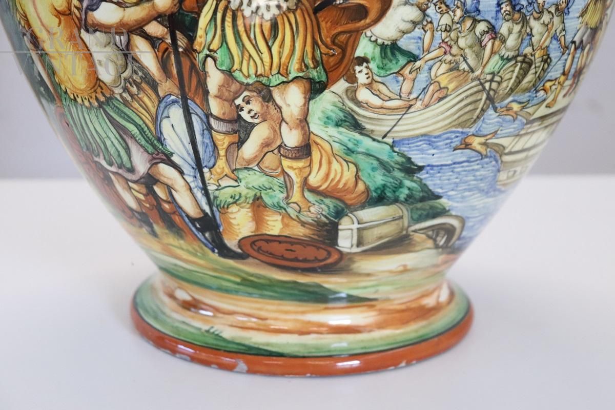 Vi presentiamo questo fantastico vaso produzione italiana zona fiorentina, risalente agli anni '80. Il vaso è realizzato in ceramica smaltata policroma. L'accattivante decorazione in stile classico che decora ogni lato di questo vaso catturerà sicuramente l'attenzione dei vostri ospiti. Valorosi guerrieri, paesaggi marini, velieri e una vegetazione lussureggiante rendono questo vaso un elemento decorativo accattivante e unico per la vostra casa. Il vaso presenta marchio FF sotto la base e Made in Italy. Marchio riconducibile alla manifattura "Ceramiche Artistiche F.lli Fanciullacci", fondata a Montelupo Fiorentino da Raffaello Fanciullacci. La base presenta due piccoli difetti; si prega di vedere le foto per i dettagli. Ciò non compromette la stabilità e l'estetica complessiva.