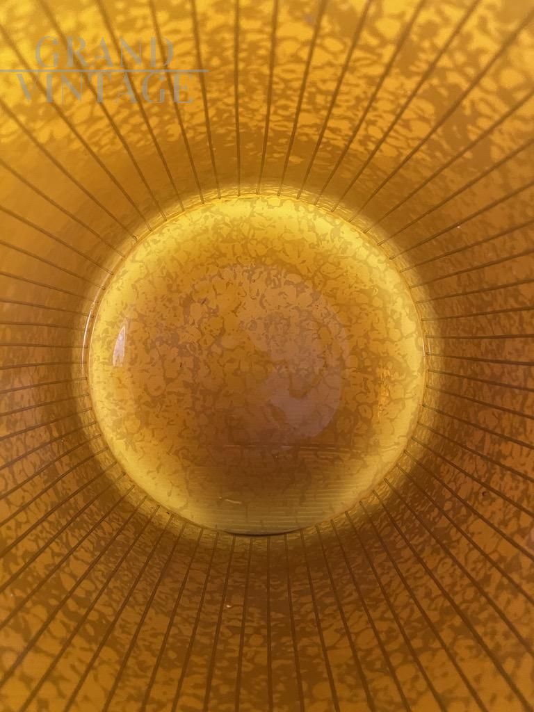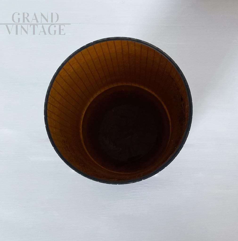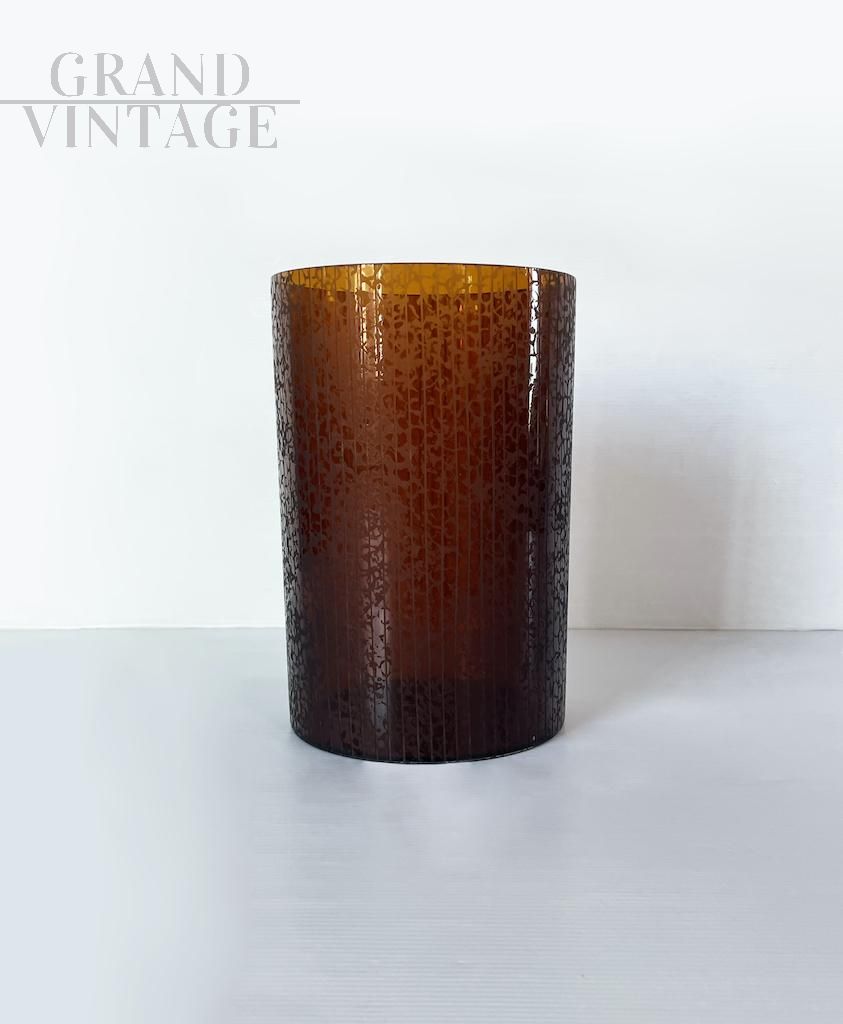 Elegante vaso cilindrico in Vetro di Murano color marrone ambrato caratterizzato da linee verticali e particolare texture che conferisce al vaso un aspetto caratteristico, soprattutto quando colpito dalla luce. Modernariato italiano anni '90.