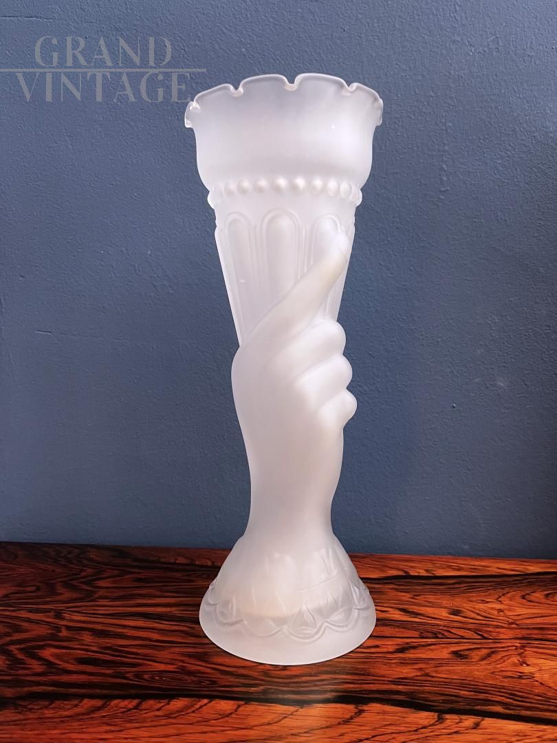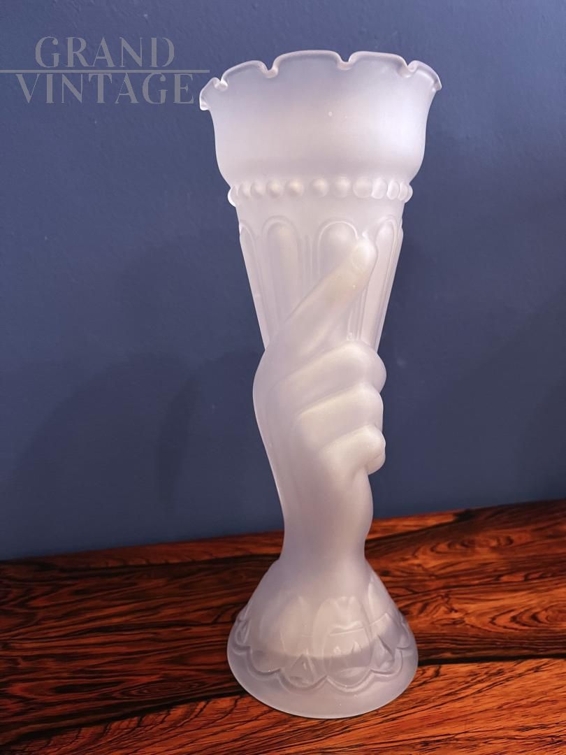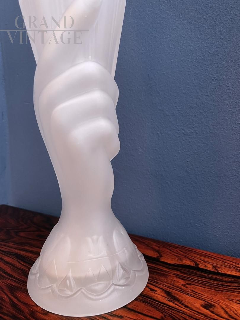 Vaso liberty in vetro satinato con mano che regge cornucopia, Francia anni '30