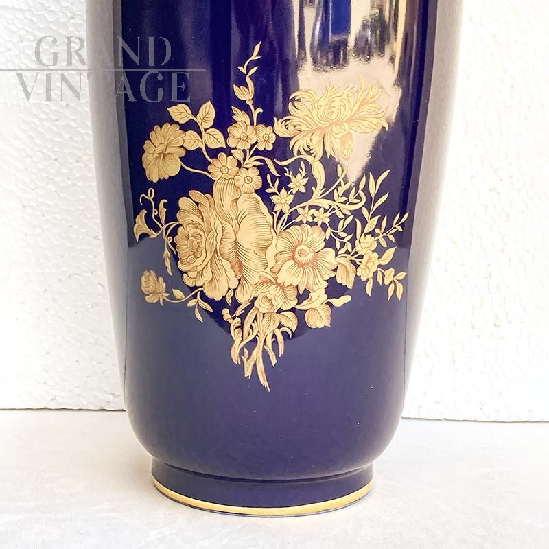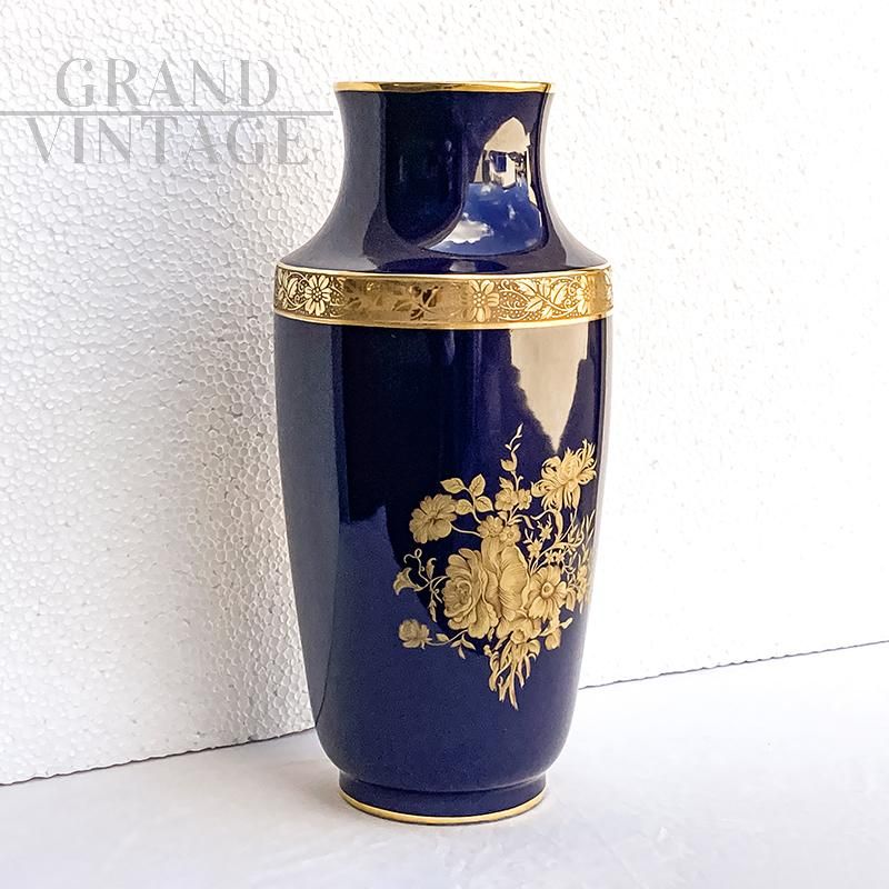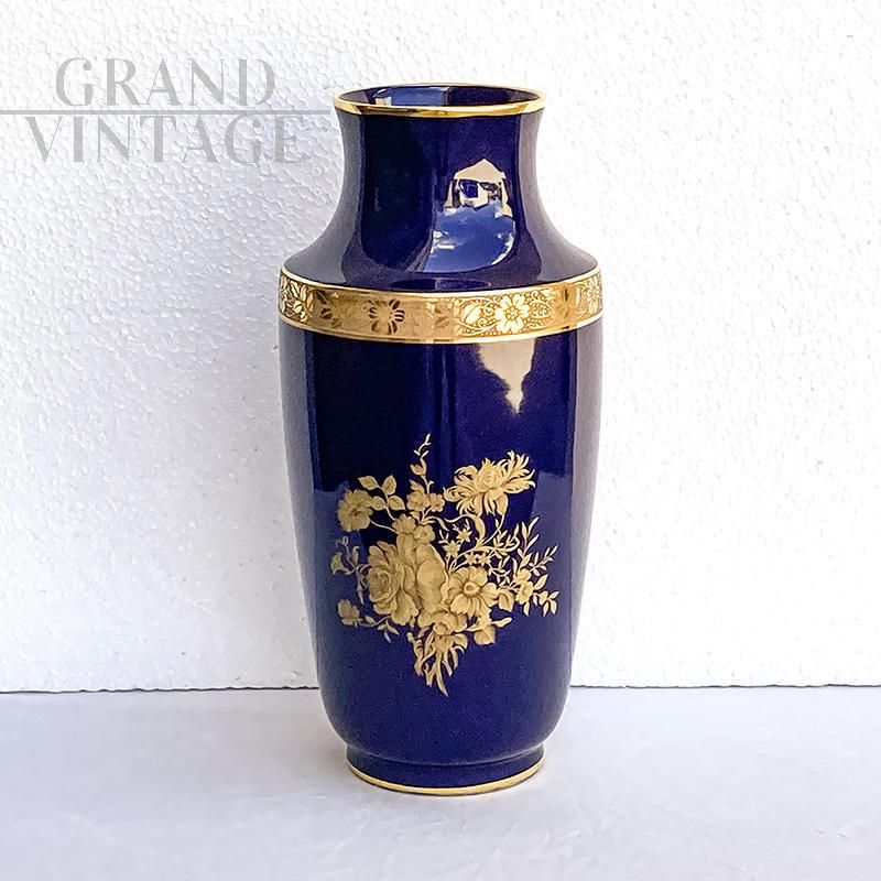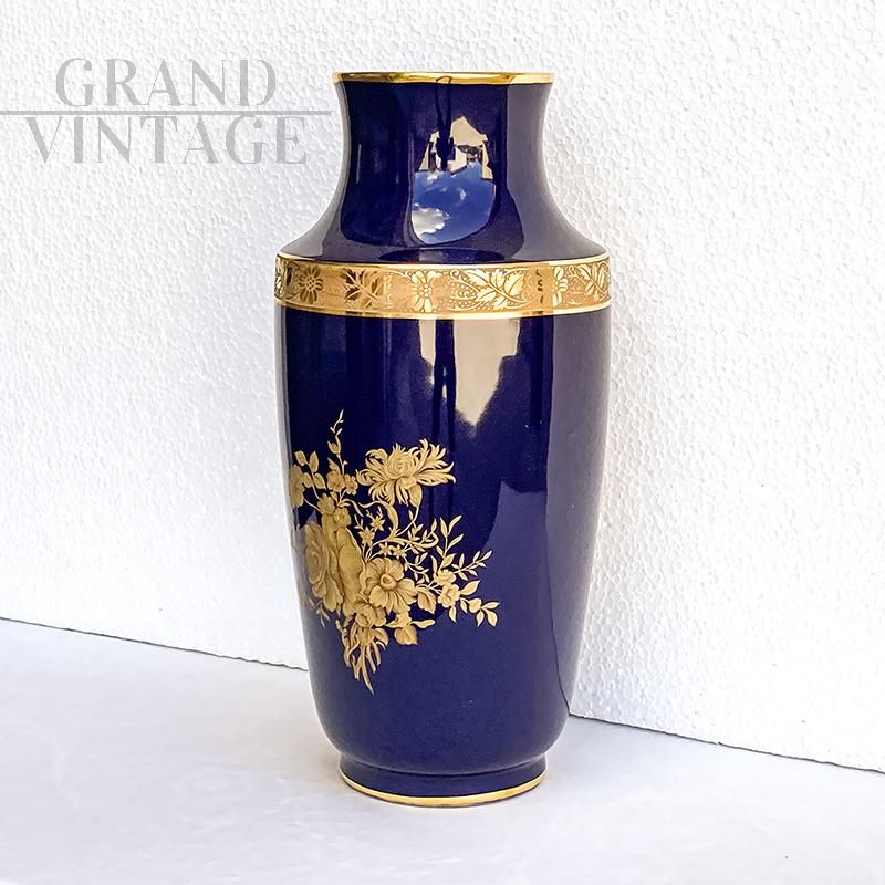 Vaso Limoges blu cobalto con decori oro zecchino, Francia metà XX secolo
