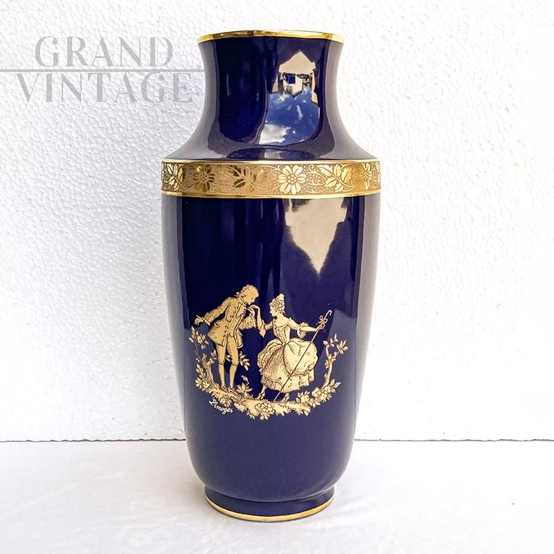 Vaso francese in porcellana Limoges color blu cobalto e decori in oro zecchino raffiguranti da un lato una dama e un cavaliere in scena galante, dall'altro una composizione floreale. In ottime condizioni, il vaso non presenta alcun segno di rottura o sbeccatura.