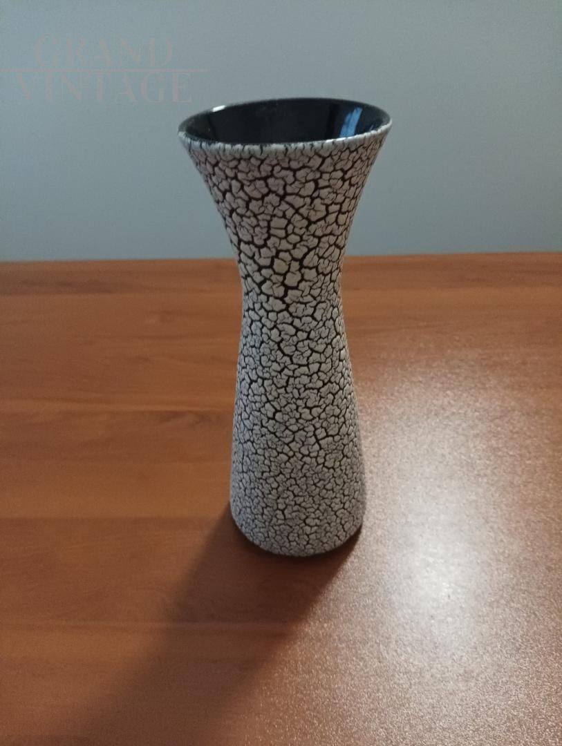 Bellissimo vaso tedesco di Jasba Keramik modello Cortina, prodotto a metà secolo in ceramica bianca e nera smaltata a crepe con effetto craquelé. L'interno del vaso è completamente smaltato di nero. I marchi alla base leggono " W. Germania" e un numero di modello 302/27. La piccola macchia di colore nero che si vede in foto è un difetto di fabbrica.