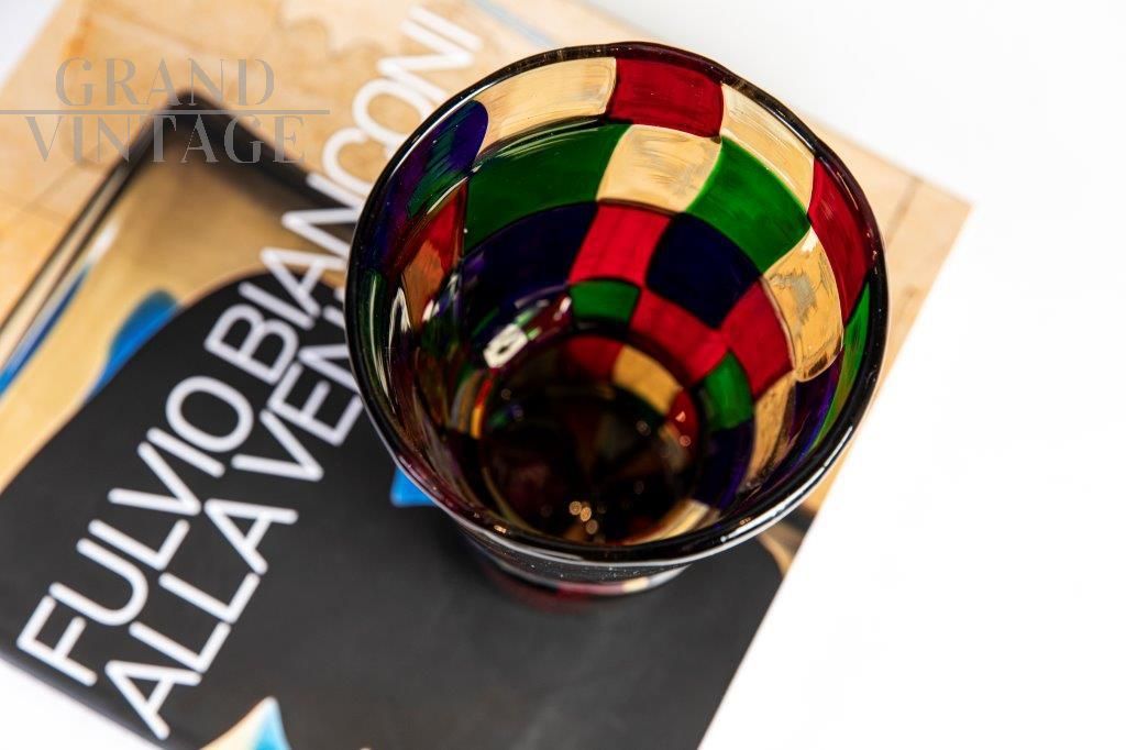 Bellissimo vaso Venini modello Pezzato disegnato da Fulvio Bianconi, in vetro Murano multicolore, riedizione anno 1996, firmato e datato sulla base, è presente ancora l'etichetta originale.