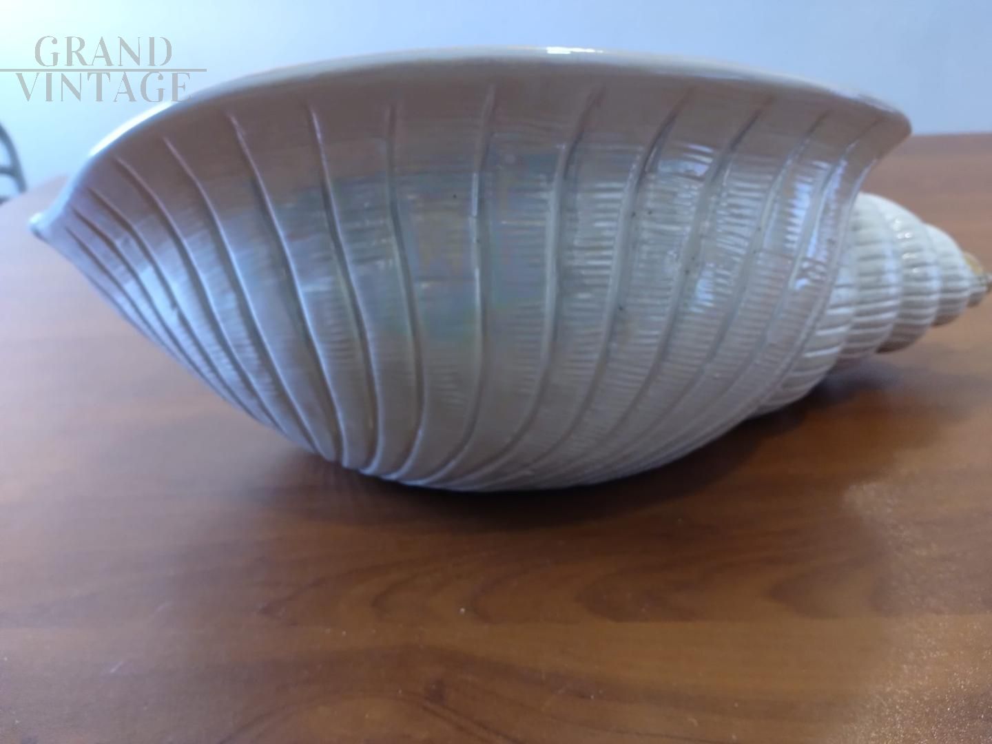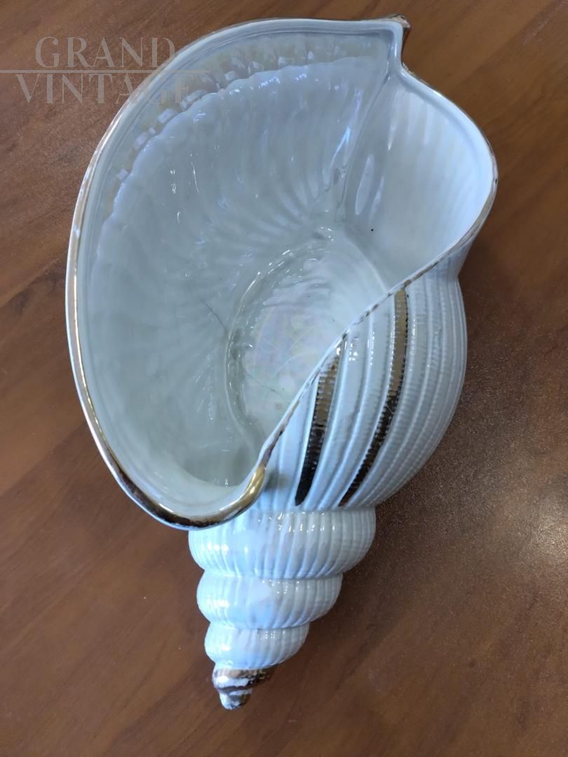 Bellissimo vaso vintage di grandi dimensioni a forma di conchiglia in ceramica bianca con bordi dorati, made in Italy.