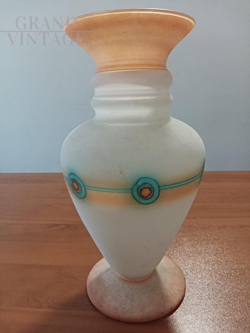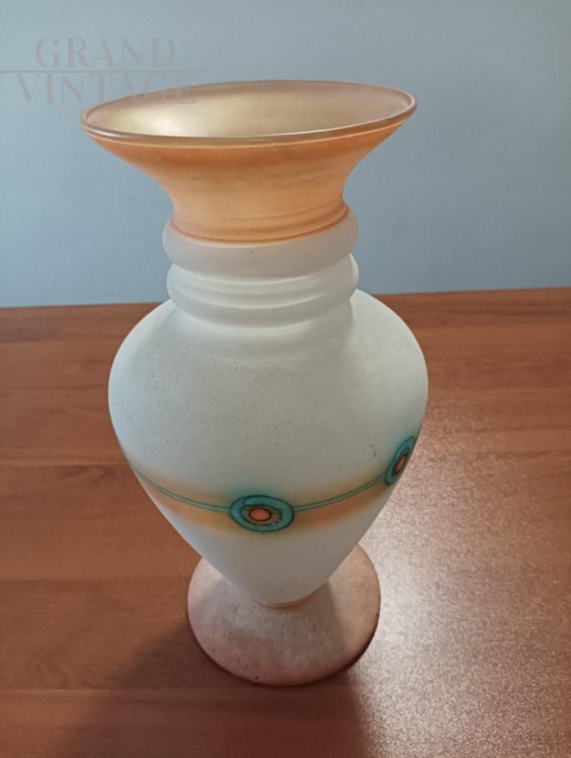 Vaso vintage in vetro di Murano opalino satinato effetto scavo dai colori splendidi che vanno dall'arancio, al pesca e all'azzurro. Completamente dipinto a mano, risale agli anni '60. Il vaso è completo di bollino.