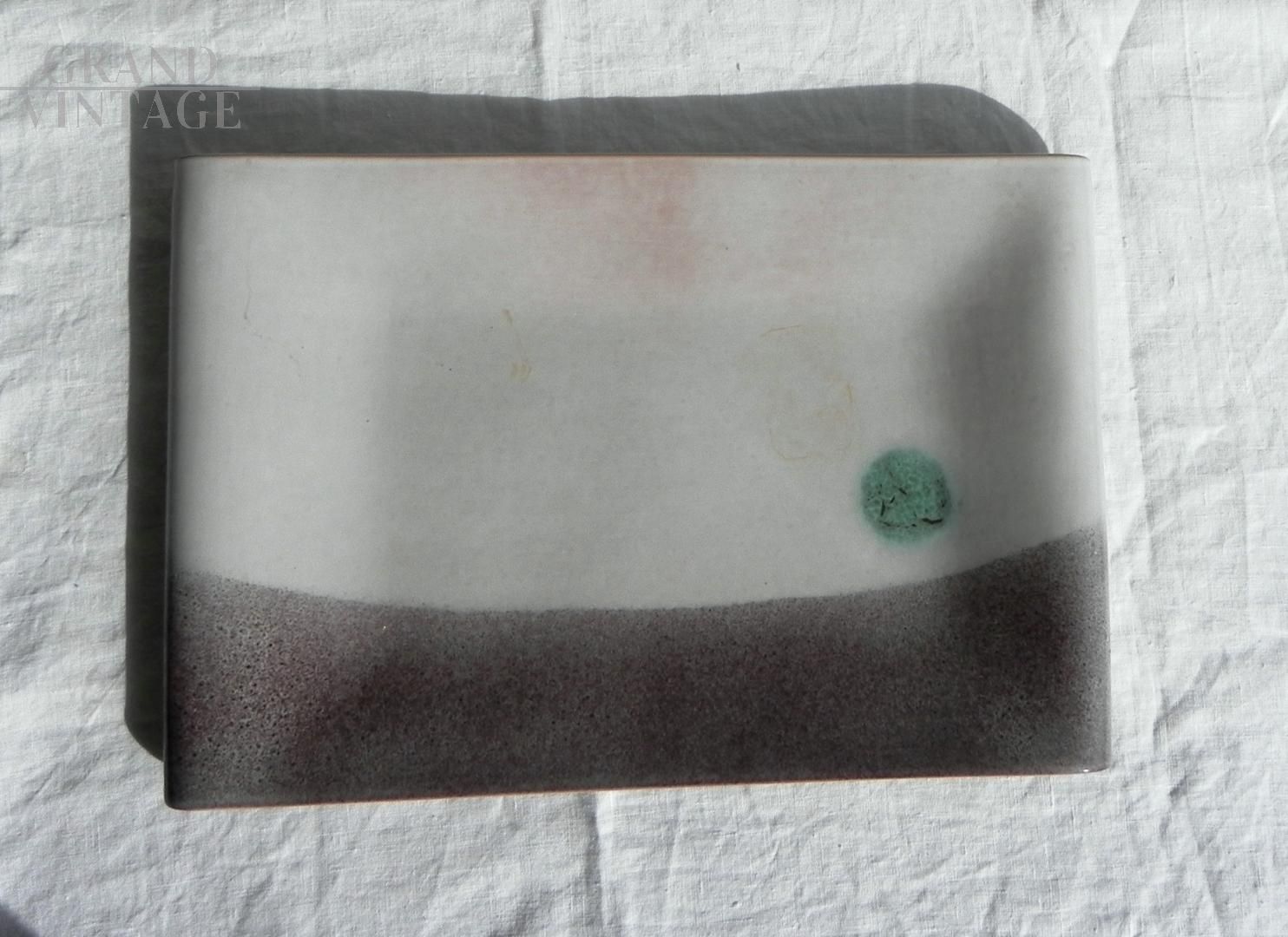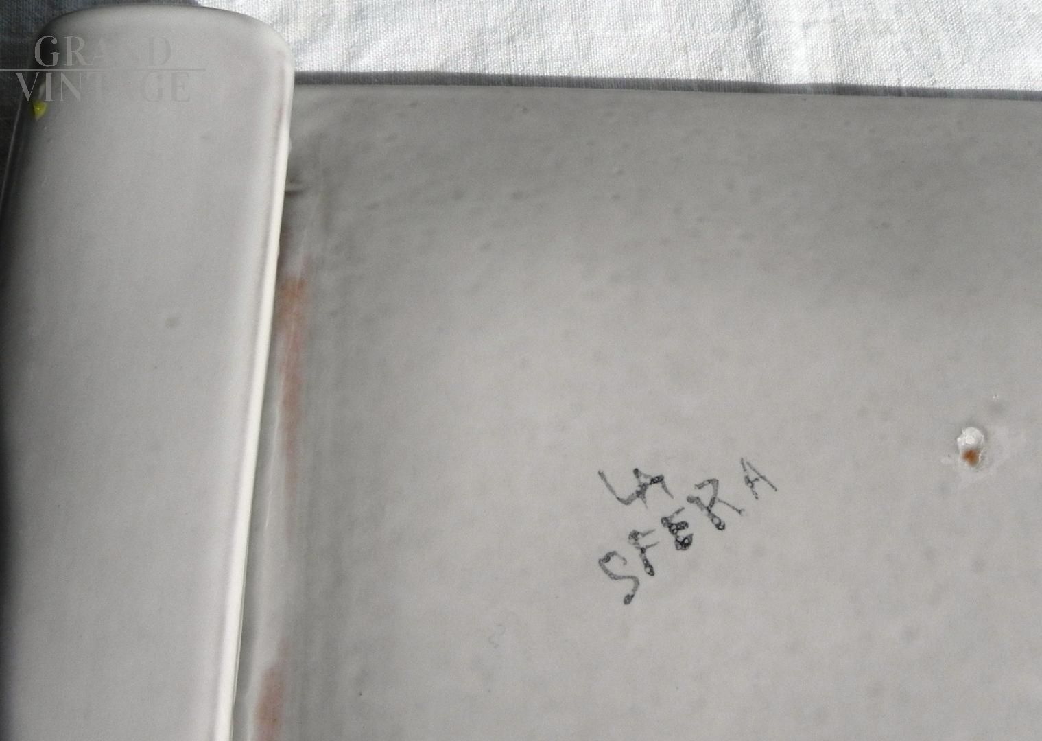 Vassoio vintage firmato La Sfera in ceramica di forte spessore curva ai lati, smaltata e decorata con un sole al tramonto stilizzato, Italia anni '70. In condizioni molto buone, senza sbeccature.