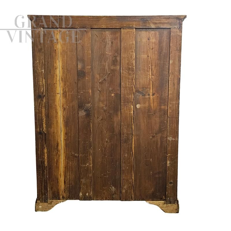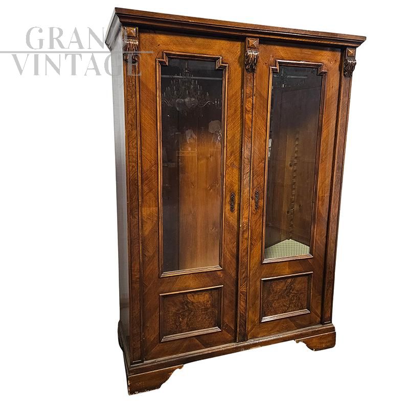 Mobile a vetrina in legno di noce finemente intagliato, dotato di due ante e due utili ripiani interni, Italia '800.