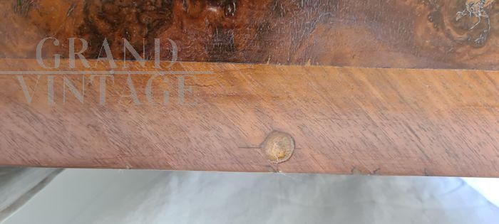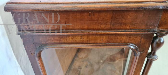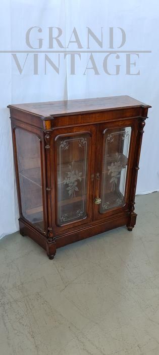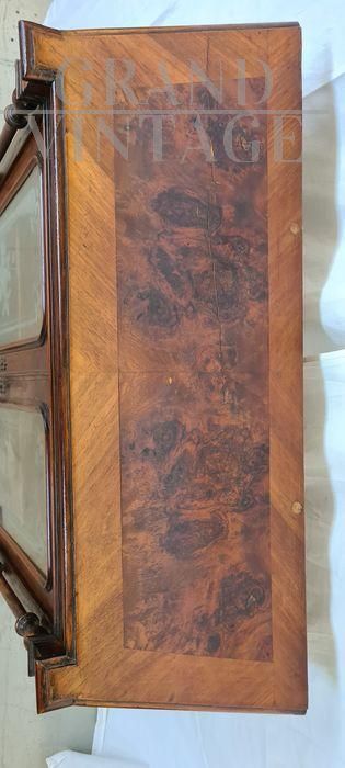 Bella vetrina piemontese in noce e radica di noce, con vetri sia nella parte anteriore sia ai lati, i vetri anteriori riportano un motivo floreale satinato. La vetrinetta è stata restaurata alcuni anni fa, presenta alcuni graffi e piccole crepe dovute al tempo, è stata sanificata e proviene da appartamento milanese dove era usata all'ingresso.