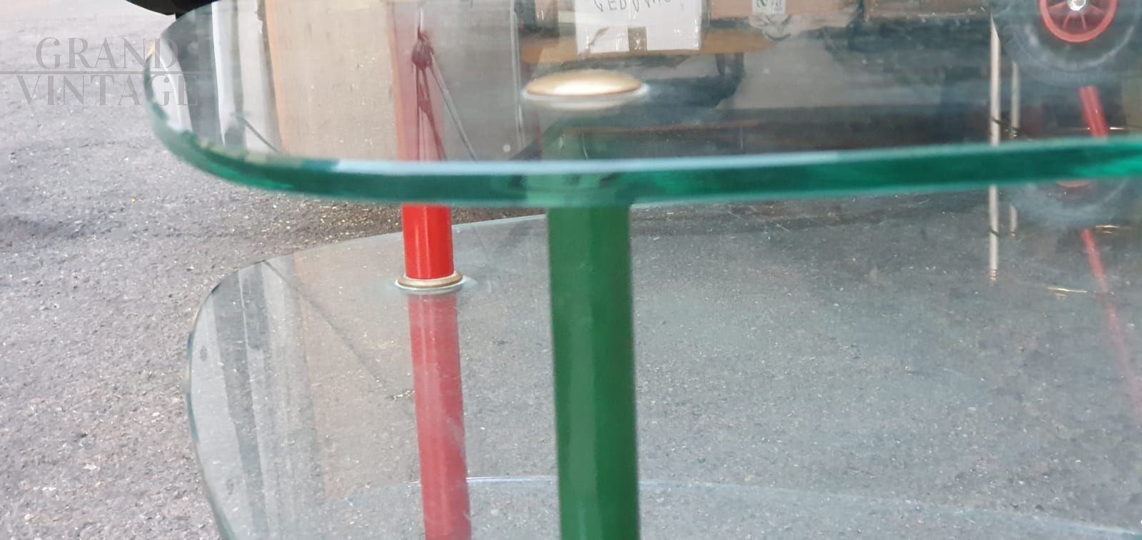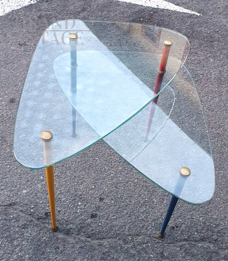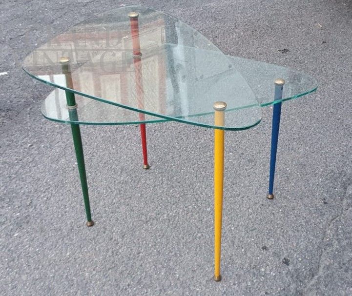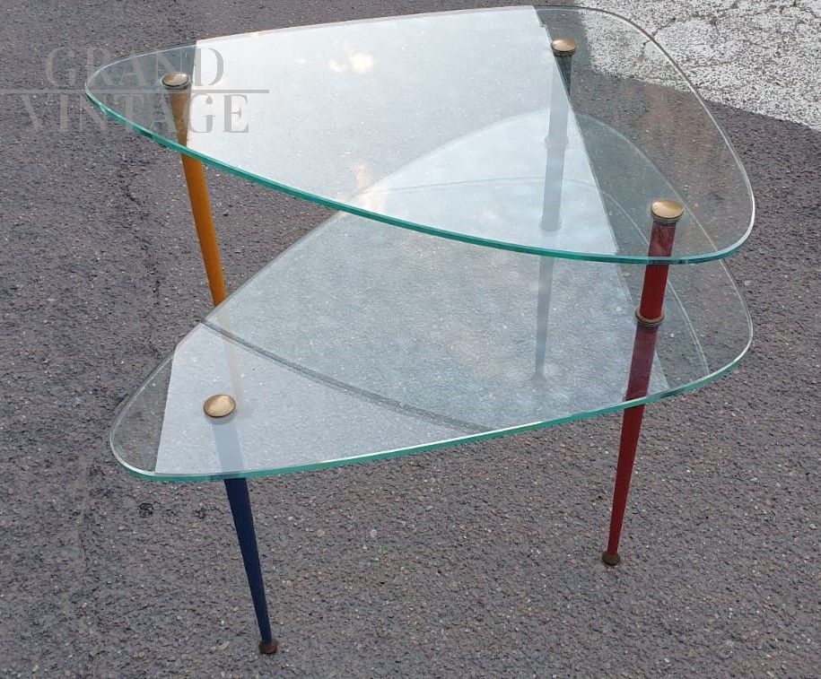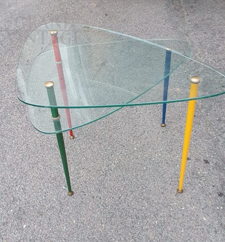 Bellissimo tavolino design Arlecchino di Edoardo Paoli per Vitrex con due piani in vetro temperato a forma di rene e quattro gambe in metallo verniciato in diversi colori: rosso, giallo, verde e blu, con dettagli in ottone. Prodotto negli anni '60, il tavolino è in ottime condizioni, i piani in vetro presentano diversi segni del tempo come da foto. E' presente la firma Vitrex, a garanzia dell'autenticità.